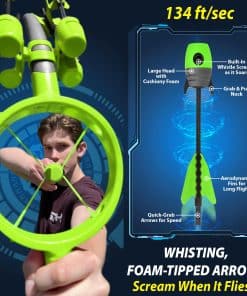 DIVERSIÓN AL AIRE LIBRE ACTIVA: Ring Strike es un arco y flecha activo y emocionante que te hace disparar, moverte, agacharte, sumergirte y rodar actividades al aire libre. Lucha, golpea, apunta a tus oponentes. Practica tu puntería y usa tu fuerza para tirar del arco y lanzarlo más rápido y más lejos que tus amigos. ¡El factor WOW es enorme cuando tiras de las cuerdas elásticas, ves la flecha volar a velocidades increíbles y escuchas el silbato mientras la flecha se dispara a más de 200 pies! Parques, playa, vacaciones y diversión en el patio trasero.