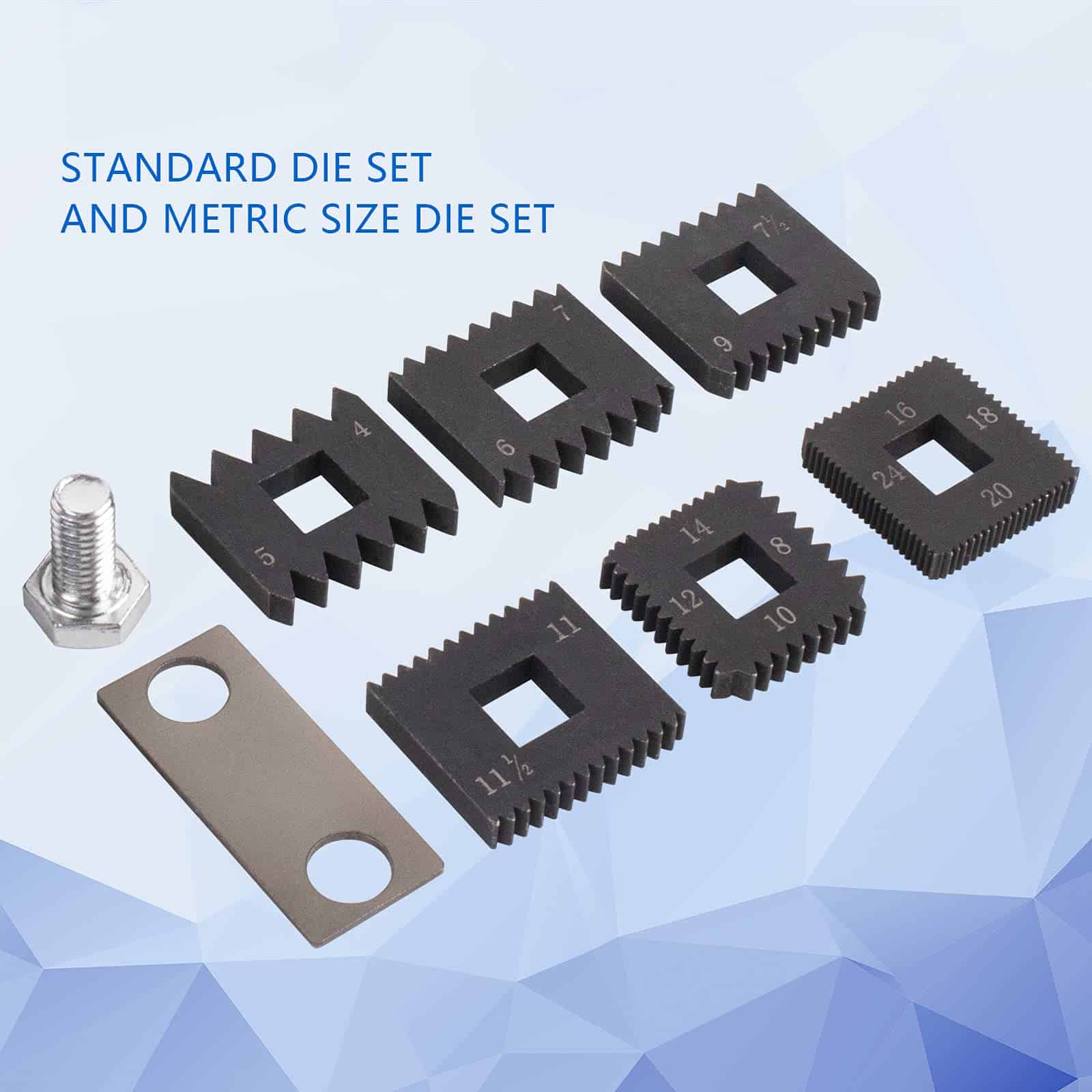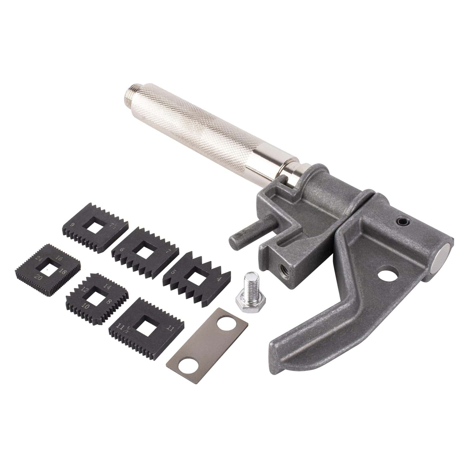4. Contiene Equipado con 6 moldes estándar No.216884 de hilos por pulgada-4 5 6 7 7-1/2 8 9 10 11 11-1/2 12 14 16 18 20 y 24.
