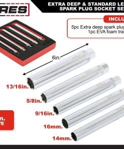 Cobertura superior, alcance superior. Este juego de llaves de bujía extra profundas de ARES garantizará que nunca te falte el tamaño de llave necesario para quitar e instalar bujías en tu vehículo. Hecho de acero al cromo vanadio duradero, tratado térmicamente y forjado en frío para una máxima precisión y tolerancia, este juego de llaves de bujía incluye cinco llaves de 6 pulgadas de longitud para reemplazar varios tamaños de bujías, incluso en áreas empotradas y de difícil acceso. Cada llave presenta marcas de tamaño de alta visibilidad para una fácil identificación y un sello de goma interno que sujeta firmemente las bujías cuando las cambia. La bandeja de espuma EVA duradera garantiza que cada llave sea fácilmente identificable y organizada en su cajón de herramientas, y con el etiquetado de alta visibilidad, nunca se quedará sin encontrar la llave que necesita. Características: Incluye: 5 llaves de bujía de 3/8 pulgadas Contiene una de cada uno de los tamaños de llave a continuación en longitudes de 6 pulgadas Tamaños: 9/16, 5/8 y 13/16, 14 mm y 16 mm Los diseños de pared delgada de 14 mm y 16 mm cuentan con 12 puntos para un agarre mejorado Construido de acero al cromo vanadio tratado térmicamente, forjado en frío para mayor durabilidad y precisión Acabado pulido a espejo El sello de goma interior retiene la bujía para una instalación más fácil Las llaves extra largas de 6 pulgadas permiten acceder a bujías empotradas y de difícil acceso Marcas de alta visibilidad Bandeja de espuma EVA duradera para un almacenamiento sencillo