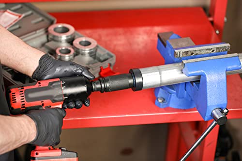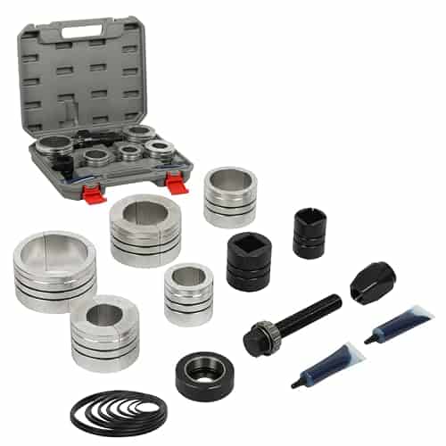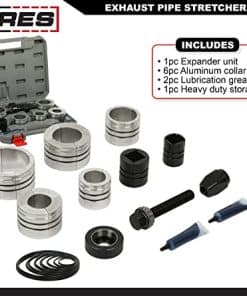 Este kit de expansor de tubos de escape está hecho de materiales robustos de acero alloy y aluminio, con un diseño de rodamiento de bolas para reducir la fricción y el desgaste, haciendo el trabajo más fácil. La unidad del expansor y su tornillo de tracción roscado son de impacto hasta 800 ft-lbs, permitiendo una aplicación de fuerza significativa para una expansión rápida. Gracias a sus componentes de impacto, la unidad del expansor de este kit se puede utilizar con llaves de impacto para una expansión rápida y sencilla, con adaptadores de collar incrementales para expandir los tubos de hasta 4-1/4 pulgadas de diámetro. Los dos tubos de grasa incluidos son perfectos para lubricar los anillos o-ring y los tornillos antes del uso, y la caja de almacenamiento incluida mantiene el kit organizado y guardado después del uso. NOTA: No apto para tubos de acero inoxidable.