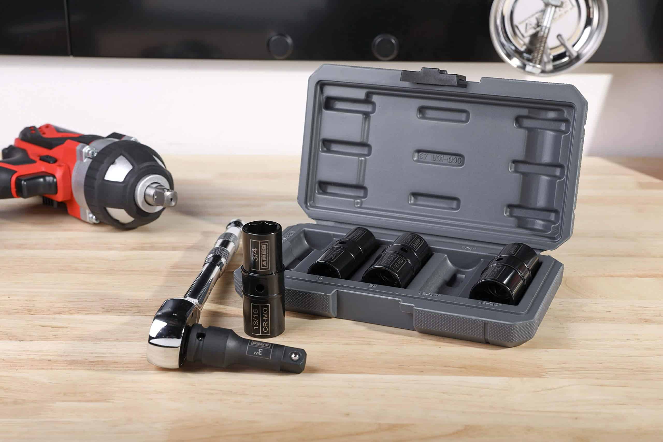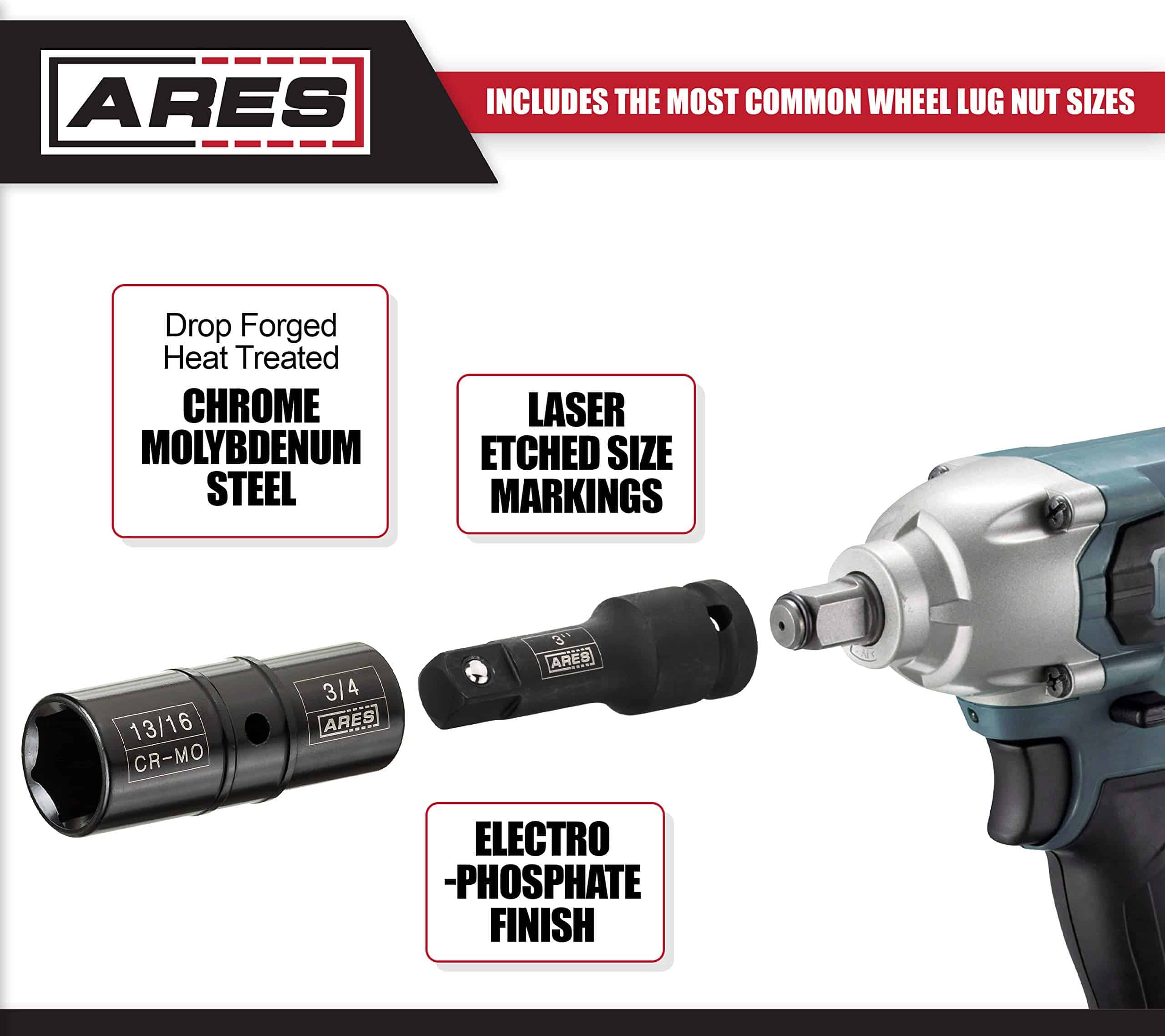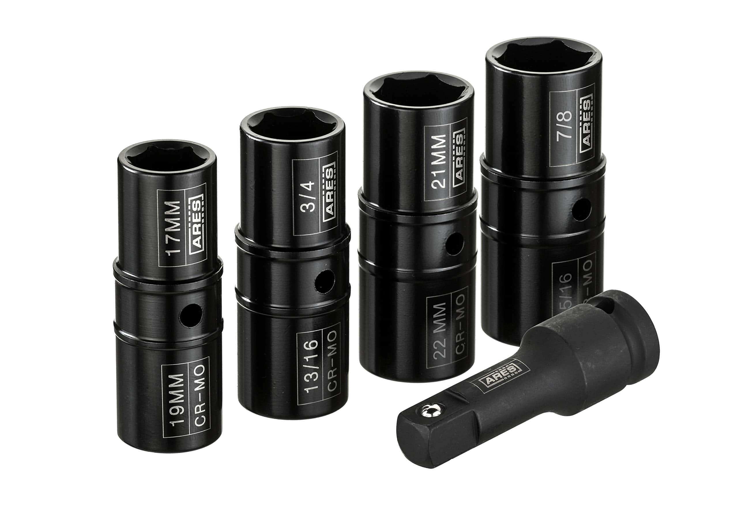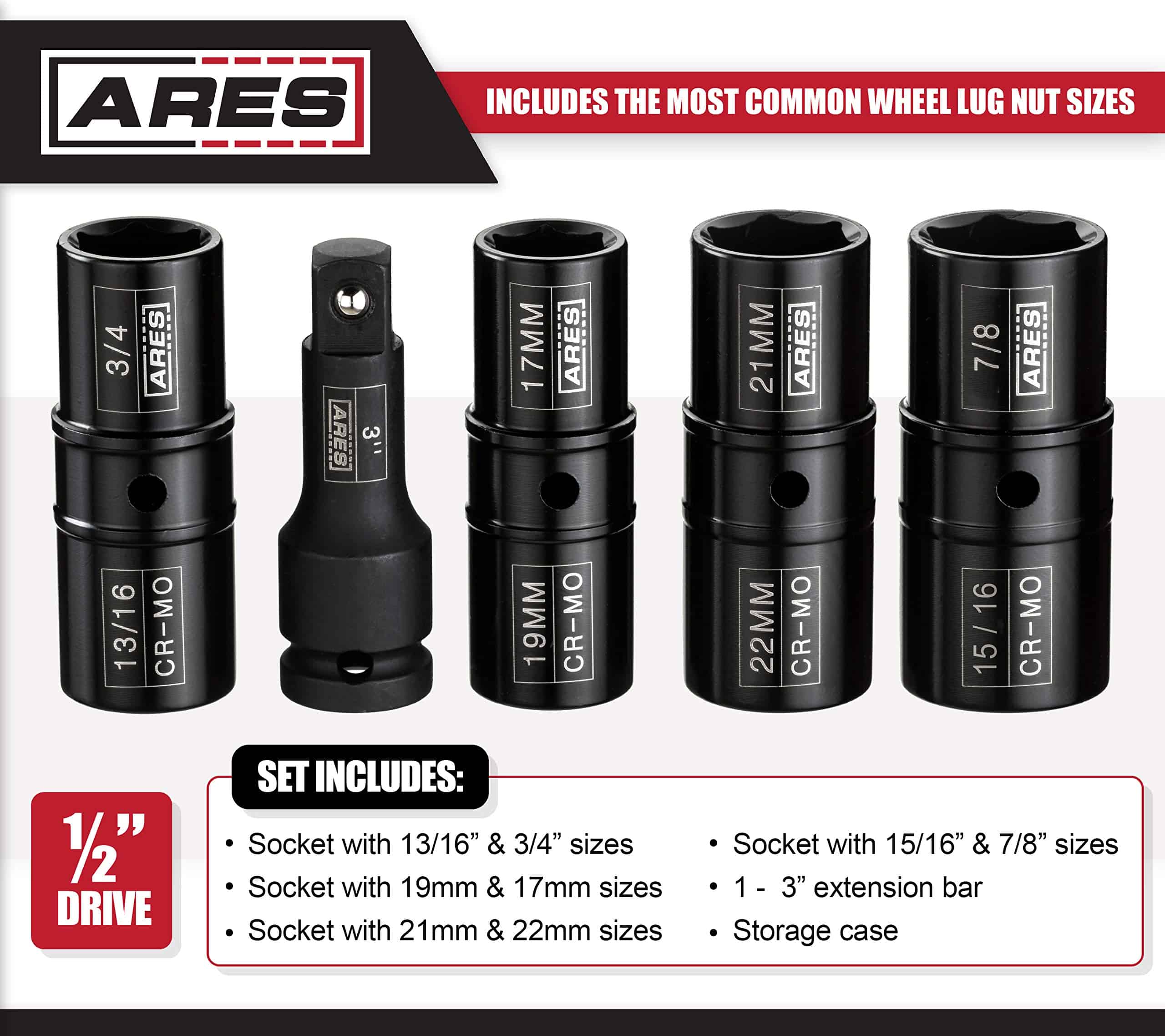 ARES 59010- Juego de 5 piezas de llave de tuercas de impacto de 1/2 pulgada – Incluye tamaños métricos de 17 mm, 19 mm, 21 mm, 22 mm y tamaños SAE de 3/4 de pulgada, 13/16 de pulgada, 7/8 de pulgada,15/16 de pulgada – Acero Cromo-Molibdeno de Grado de Impacto. Este Juego de Llave de Tuerca de Giro incluye una barra de extensión de 3 pulgadas de 1/2 pulgada de unidad y cuatro llaves de giro en los siguientes tamaños: 17 mm / 19 mm, 21 mm / 22 mm, 3/4 de pulgada / 13/16 de pulgada, y 7/8 de pulgada / 15/16 de pulgada, todo en un estuche de almacenamiento conveniente para un transporte y organización fácil. Nuestro juego de llave de tuerca de giro está hecho de acero de Cromo Molibdeno de alta resistencia. El acabado Electro-fosfato combinado con marcas de tamaño láser proporciona un aspecto elegante y una alta visibilidad. Estas llaves de tuerca de giro se pueden utilizar con una llave de impacto, trinquete de aire, barra de ruptura o llave de torsión. Estas llaves de tuerca de giro incluyen algunos de los tamaños de tuerca más populares y son un imprescindible en tu coche para cambios de neumáticos, trabajos de frenos, o cualquier cosa que requiera la extracción del neumático. ¡Los tamaños que no encajan en tu coche en este momento pueden ser útiles en un coche nuevo o para ayudar a amigos y familiares!. Los usuarios confían en ARES por ser herramientas de calidad. Estás respaldado por nuestra Garantía de Rendimiento . Si tienes algún problema con tu juego de llave de tuerca de giro ARES, simplemente contacta con el servicio de atención al cliente para obtener ayuda con la solución de problemas, piezas, sustitución o reembolso. Estamos orgullosos de ser parte del Programa de Embajadores de Negocios de la ASPCA. Si tienes una mascota, te das cuenta de que son más que una mascota, son parte de la familia. Con tu apoyo, estamos orgullosos de ayudar a esta gran organización.