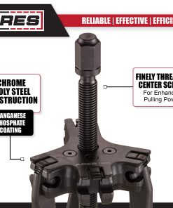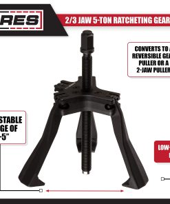 El Extractor de Engranajes de Trinquete de 2/3 Mordazas de 5 Toneladas de ARES cuenta con tres mordazas y un rango ajustable de 4 a 5 pulgadas. Construido con acero cromo molibdeno de alta resistencia y recubierto con fosfato de manganeso para prevenir la oxidación y corrosión, este diseño único permite que el extractor de engranajes se convierta rápidamente en un extractor de 2 mordazas en poco tiempo, y el tornillo central finamente roscado mejora la potencia de extracción, para que pueda deslizar suavemente y de forma segura engranajes, poleas, volantes y otras piezas de ajuste por presión del eje. Incluye: 1 unidad de extractor de engranajes de trinquete de 5 toneladas con tres mordazas que se convierte rápidamente en un extractor de dos mordazas o reversible. Rango ajustable de 4 a 5 pulgadas. Construido en acero cromo molibdeno. El recubrimiento de fosfato de manganeso previene la oxidación y corrosión. El diseño de pie de bajo perfil súper resistente permite el acceso a espacios estrechos o confinados. Funciona con el deslizamiento de engranajes, poleas, volantes y otras piezas de ajuste por presión.