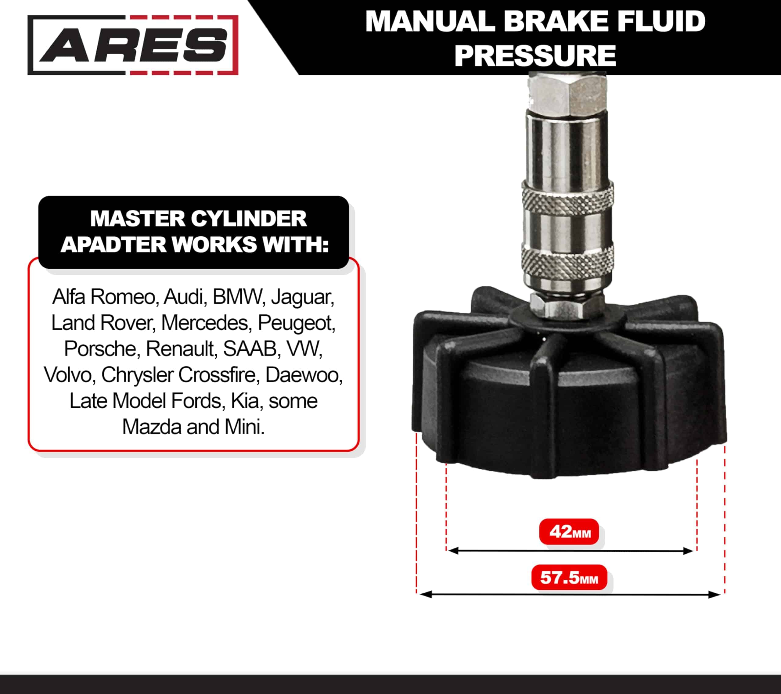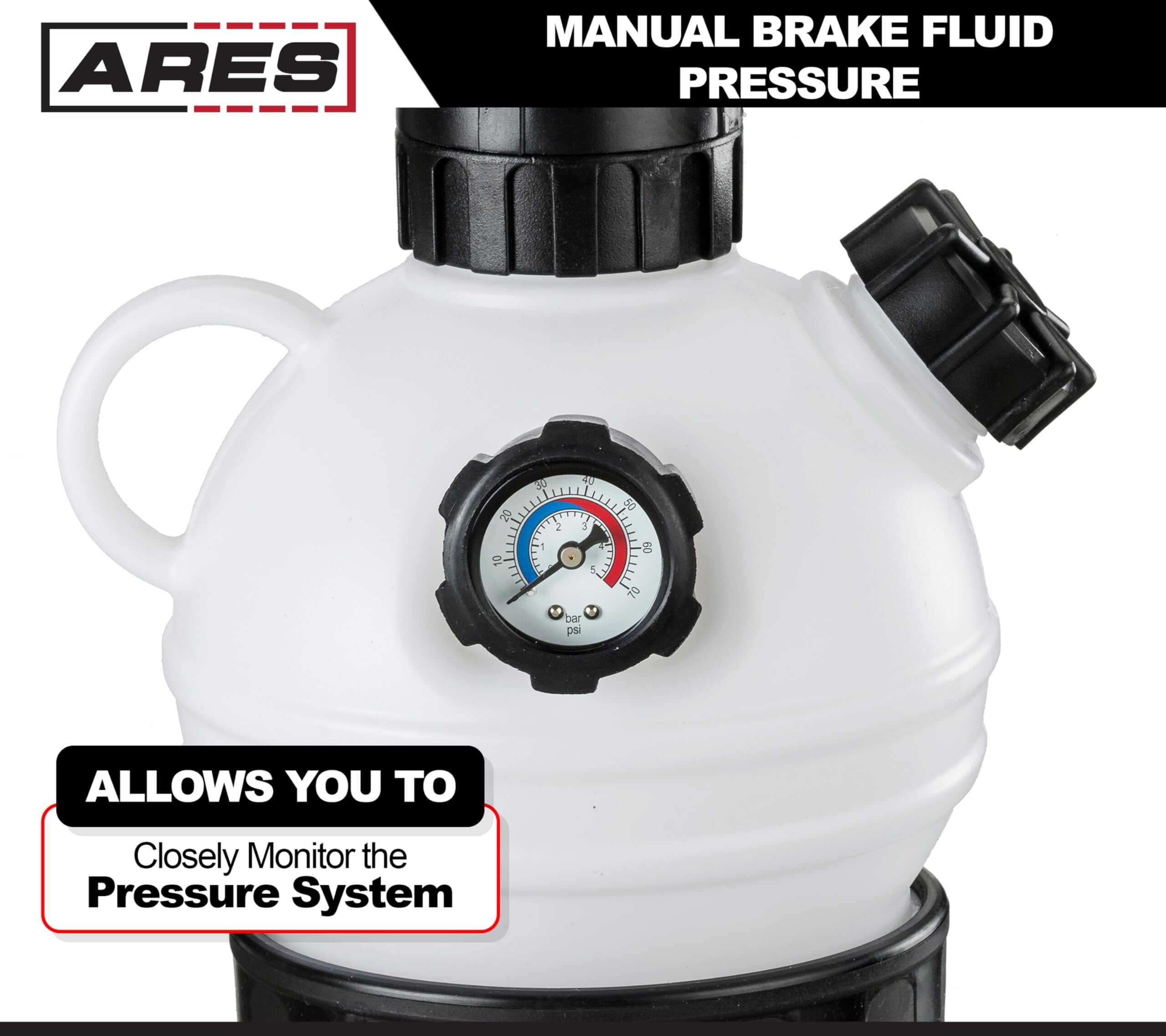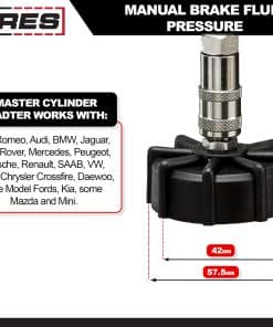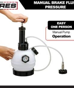1. ESPECIFICACIONES: Nuestro Freno de Presión de Líquido de Frenos Manual cuenta con un conveniente diseño operativo para una persona con un depósito de 2L resistente a la corrosión construido para manejar tus trabajos más exigentes. Ahora ofrecemos una línea completa de tapas adaptadoras de cilindro maestro que funcionan con esta unidad, incluyendo un juego completo de 12 piezas: ARES 18007.