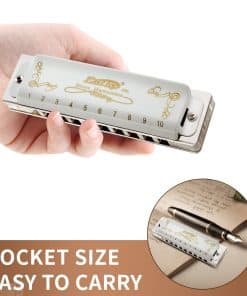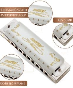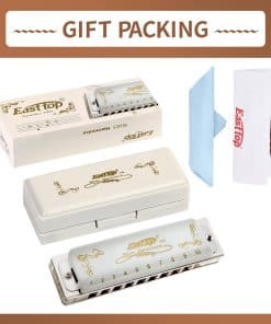 Armonica Blues East top, 10 Agujeros 20 Tonos Diatónico Armónica Blues Llave de F con Cubierta Blanca, T008L Armónica para Adultos, Profesionales y Estudiantes. Esta armónica diatónica profesional de 10 agujeros de East top, adecuada para Blues, Folk, Rock, Country, Jazz, etc., es ideal tanto para músicos de armónica profesionales como para principiantes. Presenta una exquisita mano de obra, una hermosa apariencia, un tono preciso y una respuesta receptiva. Las lenguas de bronce de precisión, la placa de lengüeta de latón (1,2 mm de grosor) con electrochapado, la cubierta de latón con pintura blanca y peine acrílico se combinan para ofrecer un sonido rico, una respuesta eficaz y una hermeticidad óptima. Sentirás comodidad al tocar, siendo fácil de utilizar técnicas como overblowing y bending, lo que brinda al intérprete una nueva experiencia. Además, gracias a su tamaño compacto de (4.01x 1.06x 0.75)»/ (102x 27 x 19)mm (L x W x H), podrás llevarla contigo a todas partes, ya sea en una fiesta, en la escuela, en la oficina o de viaje. Viene empaquetada de manera bella y se puede usar como regalo de cumpleaños, regalo de estudio adicional, recuerdo de vacaciones o regalo para reuniones de negocios y aniversarios de boda, entre otros. Incluye 1x armónica (llave de F), 1x instrucciones y 1x paño de limpieza. Somos el fabricante de armónicas de la marca East top. Respaldado por la garantía incondicional de devolución del dinero de 30 días de East top. Puedes comprar nuestros productos con total confianza.