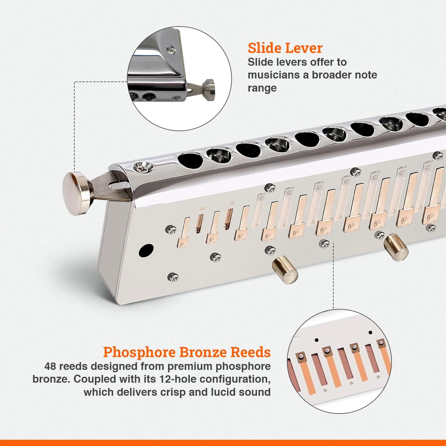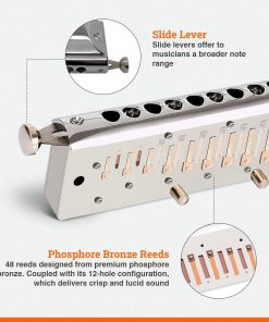 1. CONSTRUCCIÓN Y ESTÉTICA PREMIUM: Presentamos la Armónica cromática Angel 12 en la clave de D de Harmo, que presume de un atractivo cuerpo de peine acrílico blanco combinado con una elegante cubierta de acero inoxidable. Su diseño ergonómico con bordes redondeados garantiza un agarre cómodo, invitándote a tocar durante horas. 2. TONOS DE PERFECCIÓN: Con 48 lengüetas de bronce de fósforo dispuestas en una configuración de 12 agujeros, el Angel 12 ofrece un tono puro, rico y preciso en géneros como blues, baladas, clásico, jazz, pop. No importa cuál sea tu preferencia musical, esta armónica de boca está lista para armonizar con tu estilo. 3. MAESTRÍA VERSÁTIL EN ARMÓNICA: Toca en varias tonalidades como C, D, G, A, Bb y el resonante bajo C (C tenor). El deslizador responsive de la armónica y los agujeros redondeados proporcionan tanto facilidad de uso como claridad de sonido superior, haciéndola perfecta para músicos que buscan precisión y versatilidad. 4. EXCELENCIA EN LA CAJA: Cada armónica viene en una elegante caja blanca, completa con un estuche rígido duradero y un paño suave de limpieza. Esta armónica profesional, respaldada con orgullo por Harmo, una marca reconocida con sede en Eagle, Idaho, garantiza rigurosos controles de calidad para una experiencia lista para tocar directamente desde la caja. 5. REGALO MELODICO PERFECTO: Ya sea para un principiante, intermedio o jugador avanzado, la Armónica cromática Angel 12 sirve como un regalo ideal. Anima a tus seres queridos a explorar horizontes musicales, aprender con facilidad y cautivar a las audiencias con este instrumento musical de grado profesional.