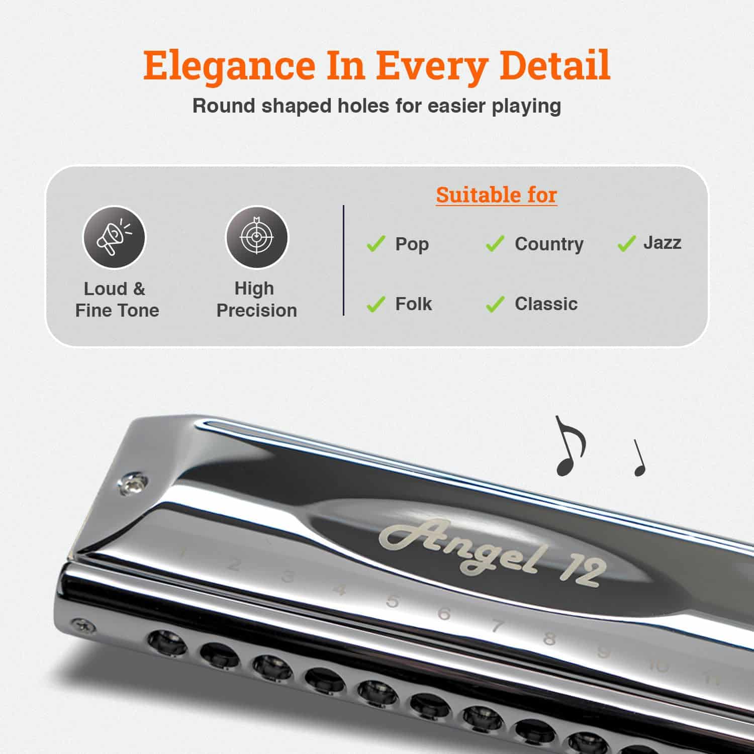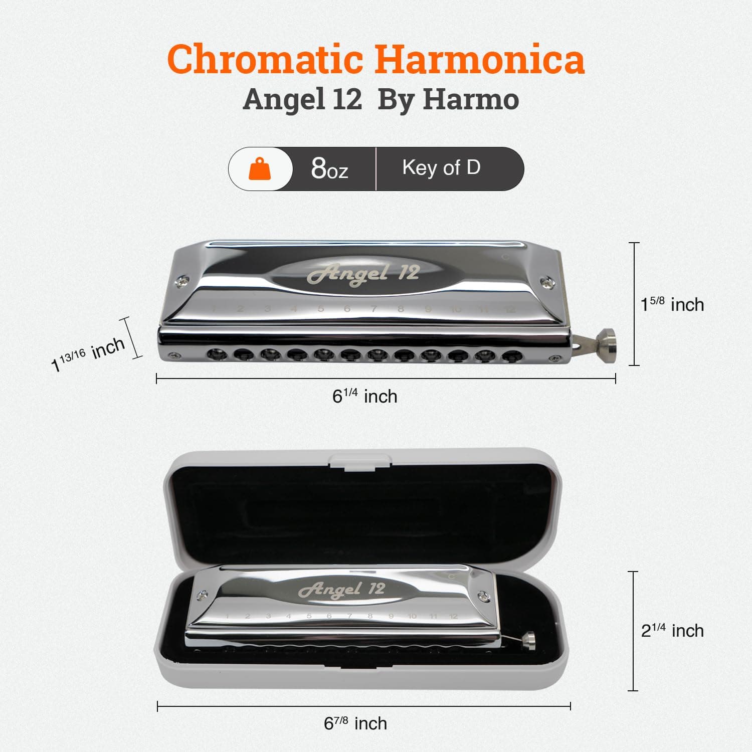 Angel 12 armónica cromática de Harmo. Elegante, precisa, cómoda. Angel 12 es una armónica cromática de 12 agujeros altamente competitiva y profesional con un cuerpo blanco dulce, que le da el toque Angel. Angel 12 ofrece un sonido puro con tono rico y preciso. Toca cada nota como desees. El deslizador es robusto, sensible y cómodo. Cuarenta y ocho lengüetas, 12-agujeros, armónica cromática estándar. Agujeros con formas redondeadas para tocar más fácilmente. La configuración y el control de calidad garantizan que todas las notas se reproduzcan bien directamente desde la caja. Incluye estuche rígido y paño de limpieza. Clave de D (también disponible en C, G, A, Bb y C bajo).