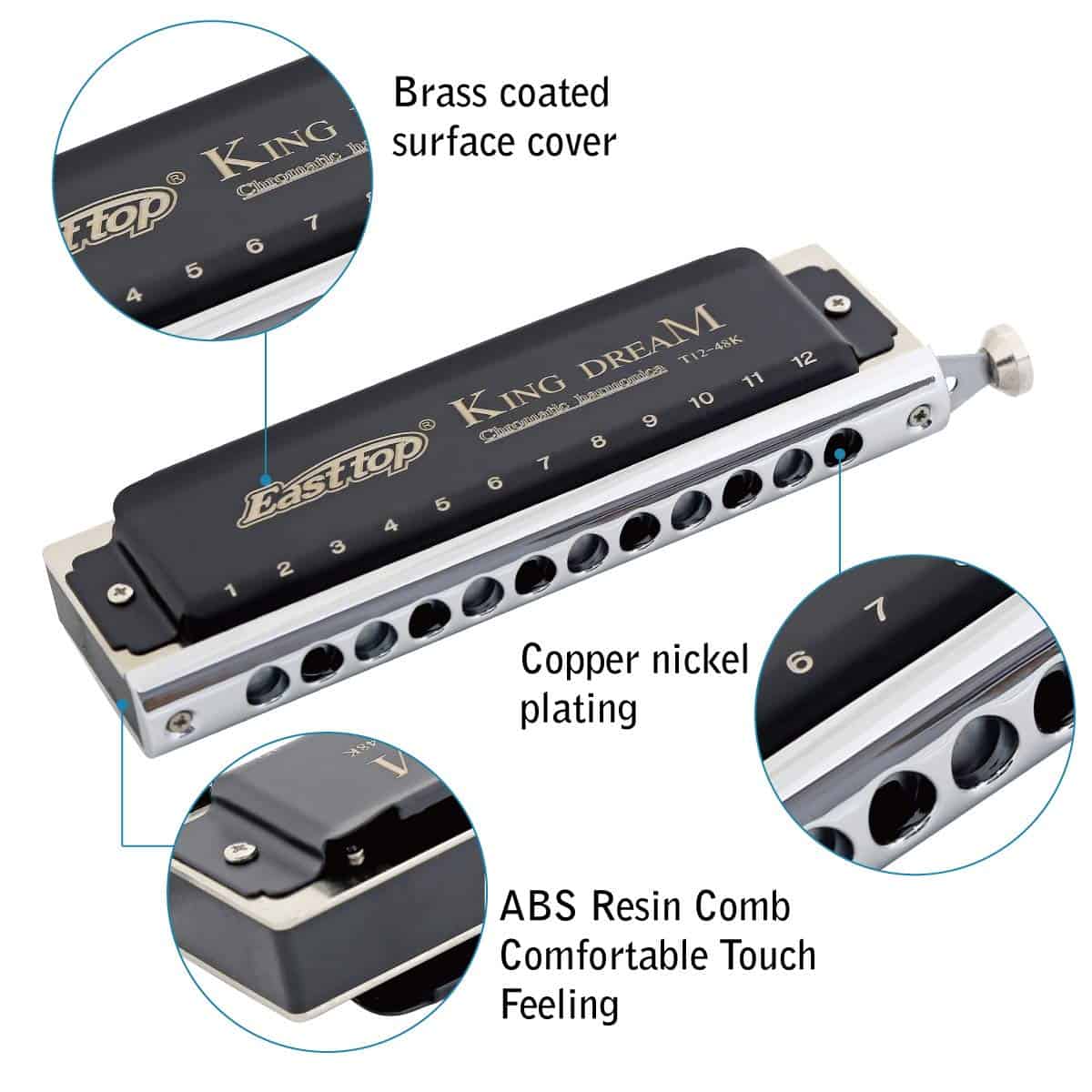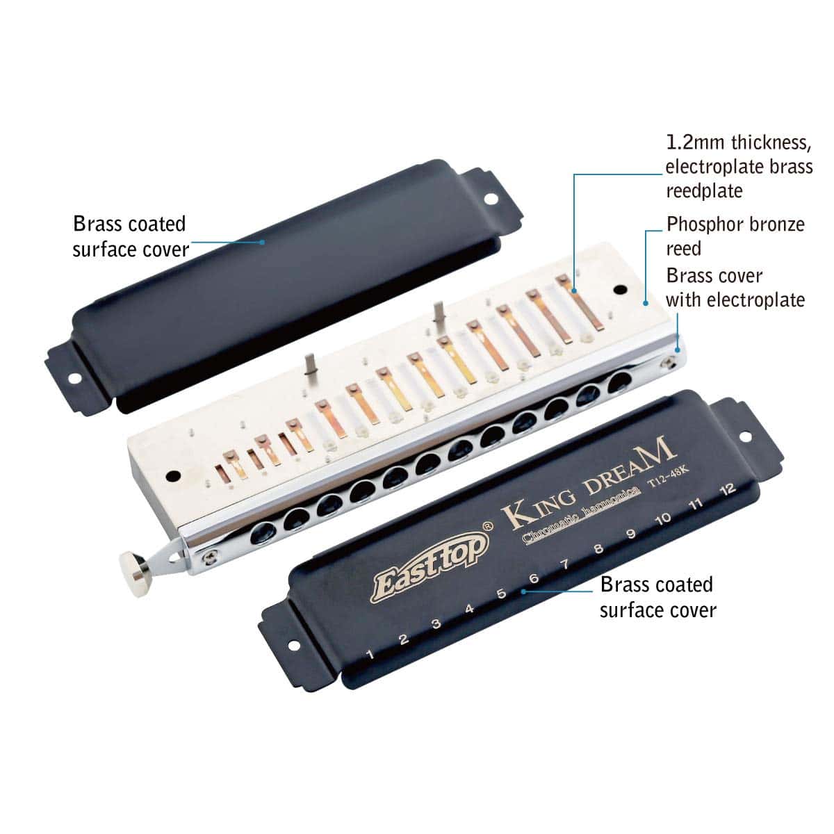 Easttop 12 agujeros 48 tonos Armónica Cromática Material: lengüetas de bronce de fosforo, placa de lengüetas de latón, cubierta de latón con pintura negra Logotipo láser de Easttop Contenido del paquete: armónica, paño pequeño, bolsa de lona Clave: Clave de Do Fácil de llevar