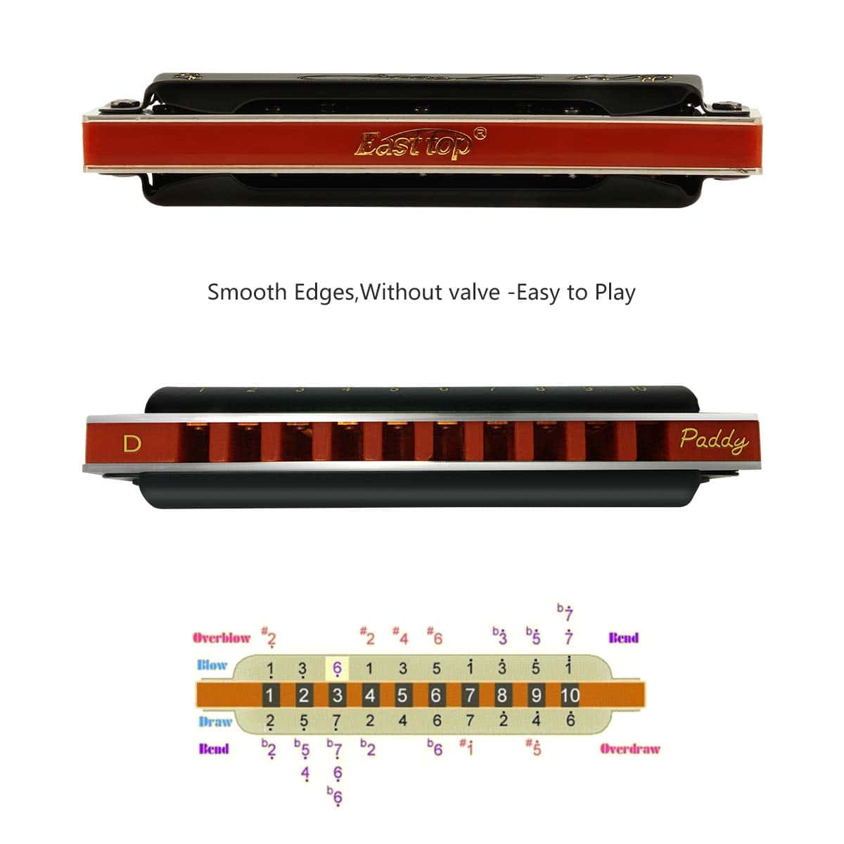 Esta es una armónica blues profesional Easttop de 10 agujeros en clave de Paddy D.