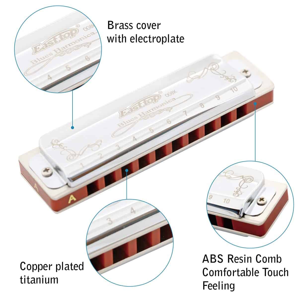 1. Armónica profesional para adultos- East top armonica diatónica profesional de 10 agujeros, adecuada para Blues, Folclore, Rock, Country, Jazz, etc. Ideal para jugadores de armónica profesionales y principiantes. Esta armónica de Blues profesional tiene una mano de obra exquisita, un hermoso aspecto, un tono preciso y sensible.