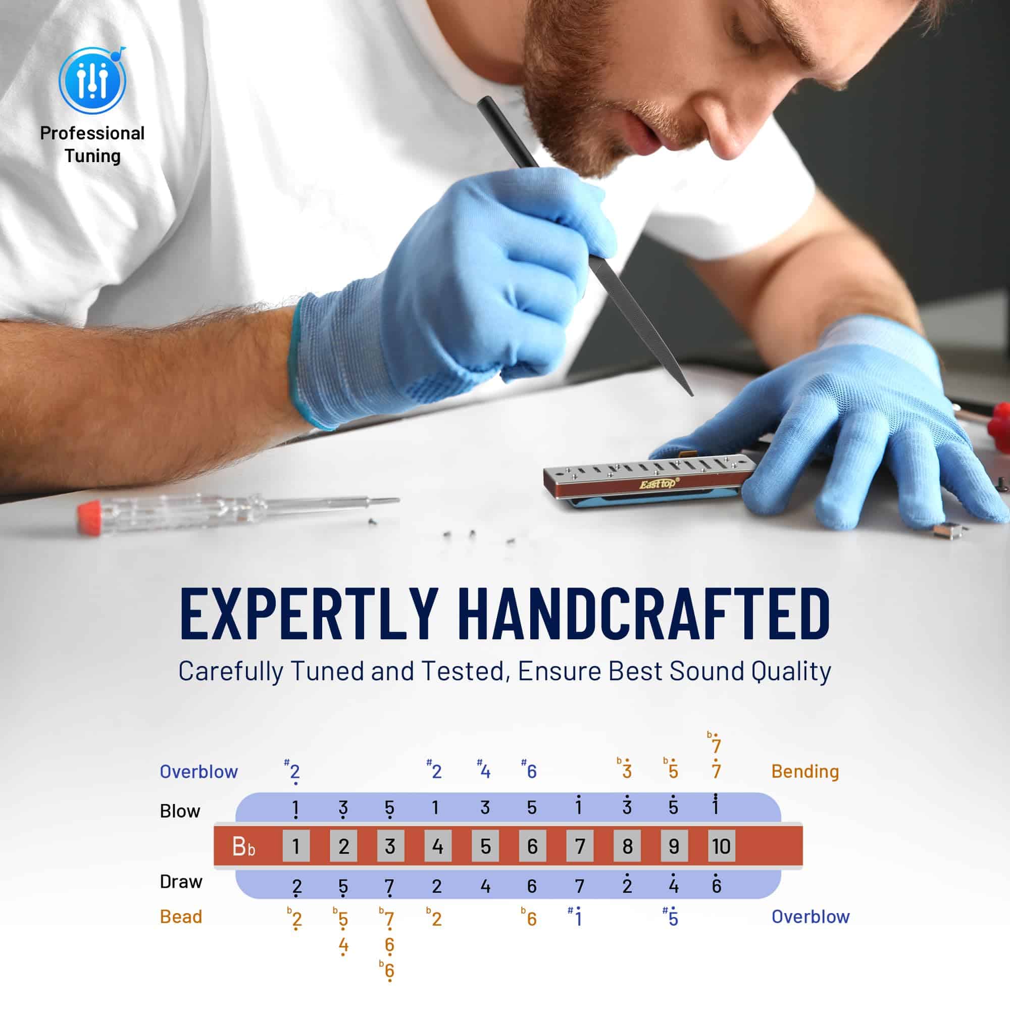 Cada armónica se ajusta y prueba cuidadosamente durante la fabricación para garantizar el mejor sonido y calidad.