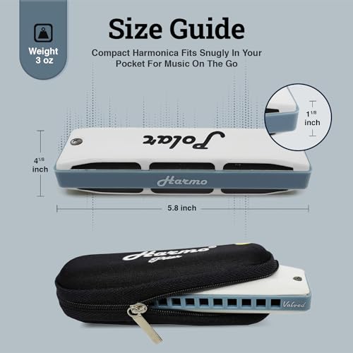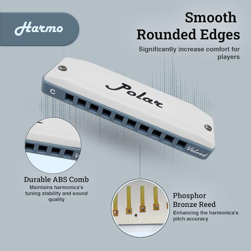 Esta armónica está afinada en Richter estándar y se le han añadido válvulas para facilitar que los principiantes e intermedios obtengan más notas sin necesidad de usar sobrecurvas. Puedes doblar más notas en una armónica semi-valvulada que en una armónica estándar (pero no puedes sobreinsuflar). Las válvulas se utilizan comúnmente en armónicas cromáticas y también pueden resultar útiles en una diatónica para jugadores que saben doblar y prefieren utilizar esta técnica tradicional para obtener notas adicionales en lugar de intentar el enfoque más moderno de las sobrecurvas. Doblar cañas valvuladas también da un sonido diferente que doblar cañas estándar. La Armónica diatónica Polar de Harmo ¡Increíble, Versátil, Elegante! La armónica Polar utiliza un proceso específico interno que la hace particularmente bien ajustada para una interpretación potente y precisa, proporcionándote una gran proyección, estanqueidad y un buen montaje inicial apto para sobreinsuflar. Tono completo y fuerte con respuesta rápida. Las cubiertas mate blancas del Polar son una característica única que te hará destacar entre la multitud. Los bordes son muy suaves y adecuados para cualquier armonicista. La Armónica Diatónica Polar de Harmo Semi-valvulada viene en 13: Do, Do#, Re, Mib, Mi, Fa, Fa#, Sol, Lab, La, Sib, Si, Fa Baja. El paquete incluye: Un estuche resistente con cremallera mantiene el polvo fuera y permite la evaporación de la humedad. Se incluye un paño de limpieza Instrucciones básicas de juego