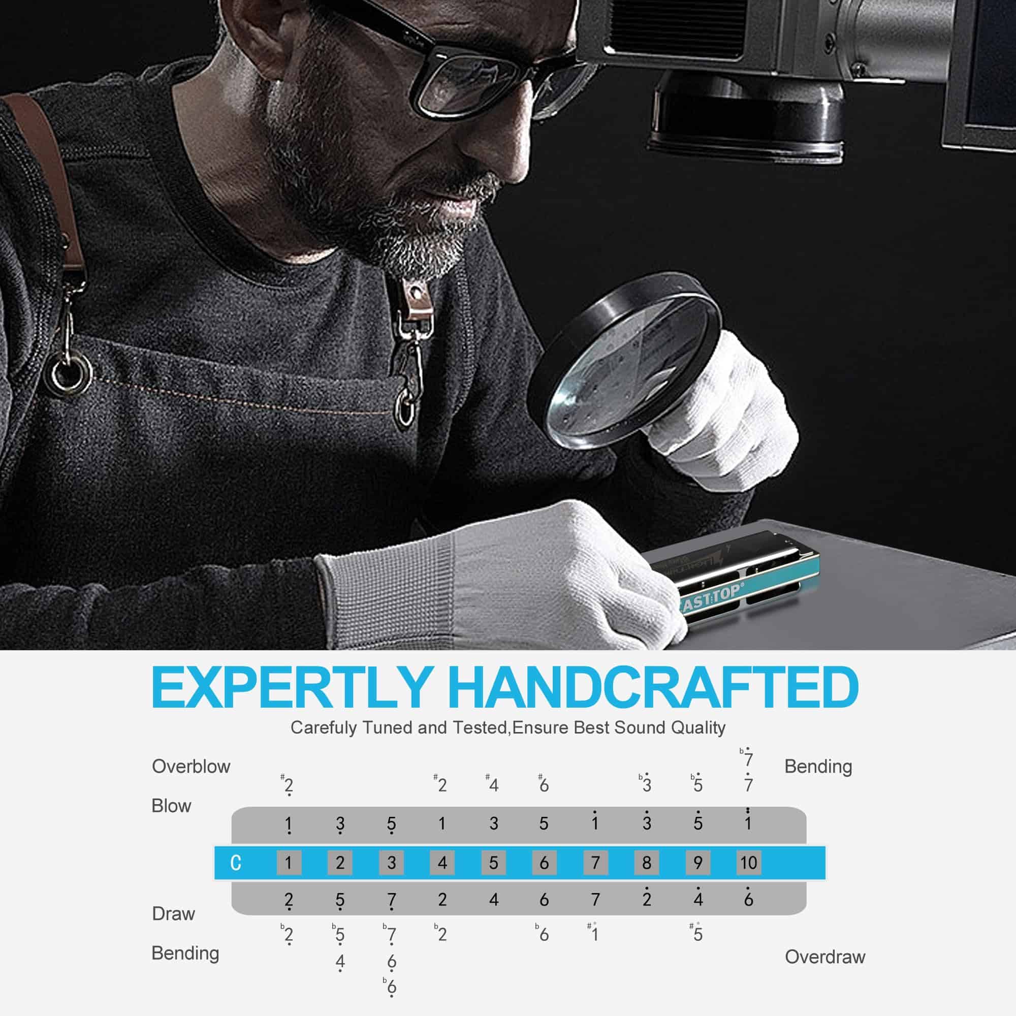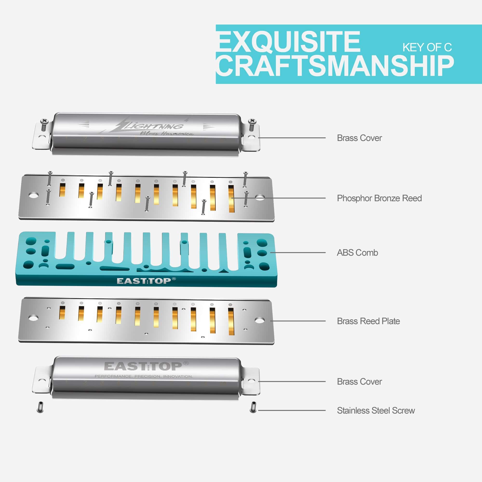2. Sonido rico, sensible, estanqueidad- lengüetas de bronce fosforado con placas de lengüetas de latón soldadas (1.2mm) con electroplatinado, cubierta de latón con electroplatinado, peine ABS. Al mismo tiempo, te sentirás cómodo al tocar, fácil de usar la técnica, como el over-blowing y bending, brindando al intérprete una nueva experiencia.