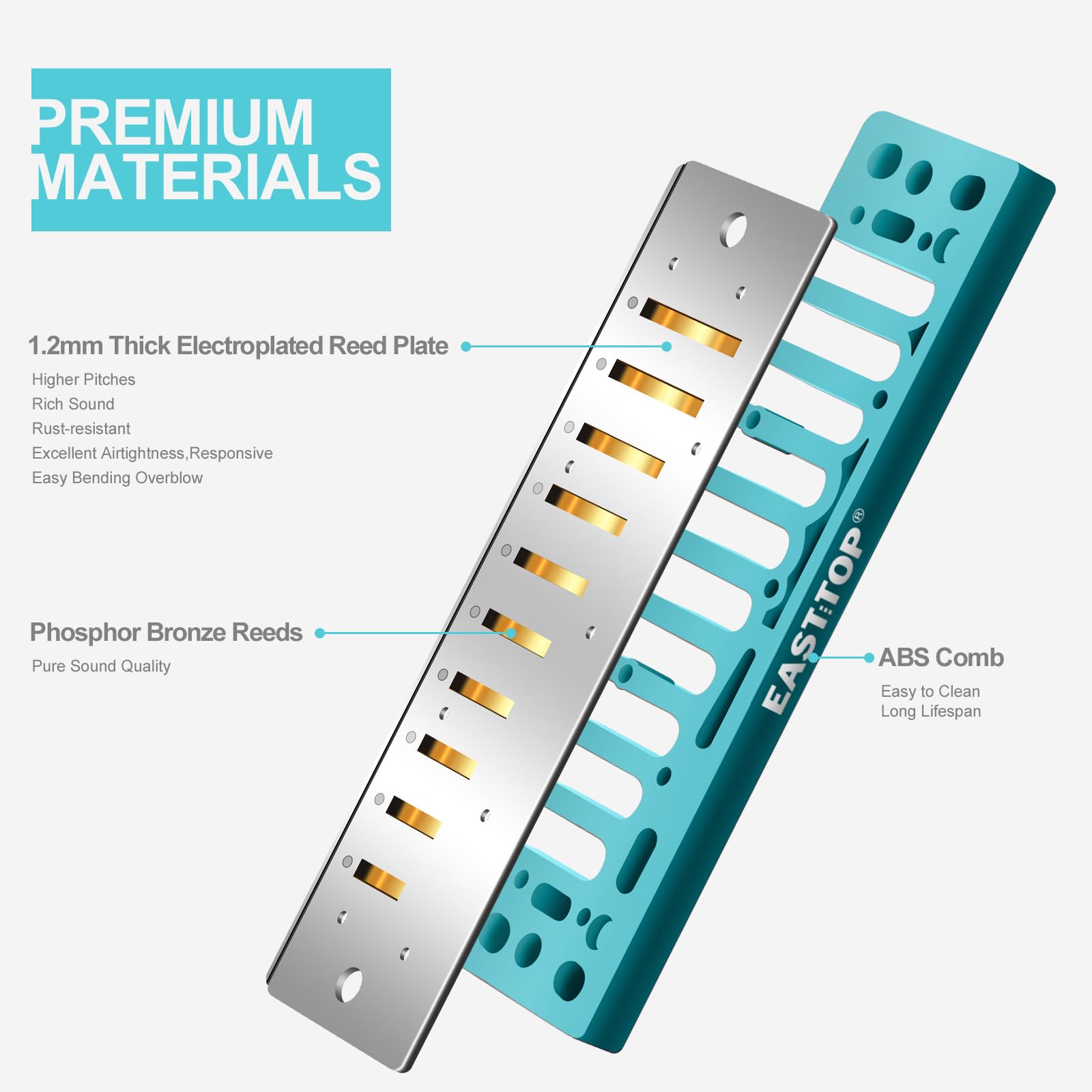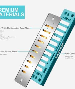 2. Sonido rico, respuesta, estanqueidad – lengüetas de bronce fósforo soldadas, placa de lengüeta de latón (1,2 mm) con electrochapado, cubierta de latón con electrochapado, peine de ABS. Al mismo tiempo, te sentirás cómodo al tocar, fácil de usar las técnicas, como el sobre-soplo y la flexión, dando al intérprete una nueva experiencia.
