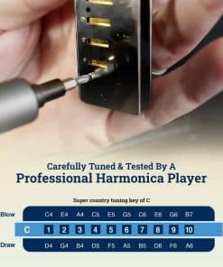 Esta armónica está especialmente afinada (no estándar afinación Richter) para que sea más fácil para principiantes e intermedios tocar melodías principales en Cross Harp también conocido como juego en 2ª posición. Estarás tocando una armónica en C en la clave de Sol mayor. (la clave en la que tocas está a una quinta por encima de la clave de la armónica) Si conoces patrones básicos principales en la armónica afinada estándar, puedes usar fácilmente una armónica afinada y reutilizar la mayor parte de lo que ya sabes sin tener que aprender nuevos patrones y teoría compleja. En la tabla a continuación se puede ver un claro ejemplo de cómo la armónica diatónica Harmo Polar súper Country afinada te ayuda a tocar melodías principales con más facilidad y puede resultar útil para copiar esos rápidos licks de violín, mandolina o gaitas. Escala de Sol mayor en 2 octavas Do estándar 2 obligado + 1 sobre-obligado Do súper Country 1 obligado Diferencia entre la afinación estándar y la afinación súper país La armónica afinada super country de Polar tiene la 5ª y 9ª nota elevada permitiendo una reproducción súper suave de licks principales rápidos sin la necesidad de sobre-obligar el agujero 5 o incluso doblar el agujero 9! Armónica diatónica Polar de Harmo Increíble, Versátil, Estilosa. La armónica Polar utiliza un proceso específico interno que la hace particularmente bien ajustada para una ejecución potente y precisa que te proporciona una gran proyección, estanquidad al aire y una buena configuración inicial amistosa para los overblow. Tono completo y fuerte con una respuesta rápida. Las cubiertas blancas mate de Polar son una característica única que te hará destacar entre la multitud. Los bordes son muy suaves y adecuados para cualquier intérprete de armónica. La armónica diatónica Polar de Harmo con afinación Country súper viene en las 5 claves más útiles para la música Country, Bluegrass y Celta: Armónica Clave de Afinación Clave C G Re A Fa Do G Re A Mi Paquete incluye: Un estuche resistente con cremallera mantiene el polvo fuera y permite que la humedad se evapore. Se incluye un paño de limpieza Instrucciones básicas de juego