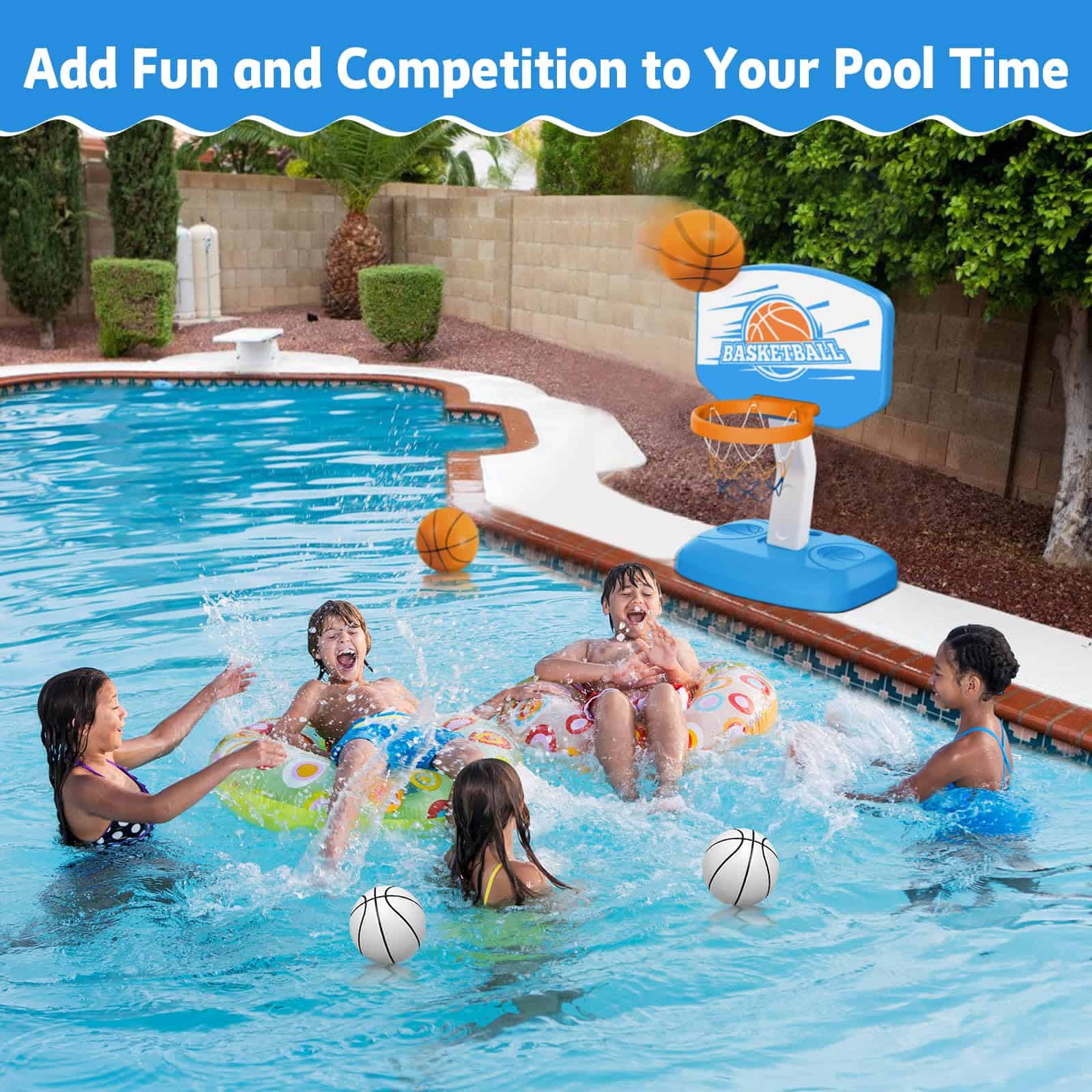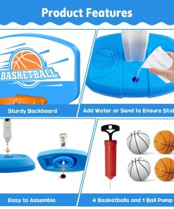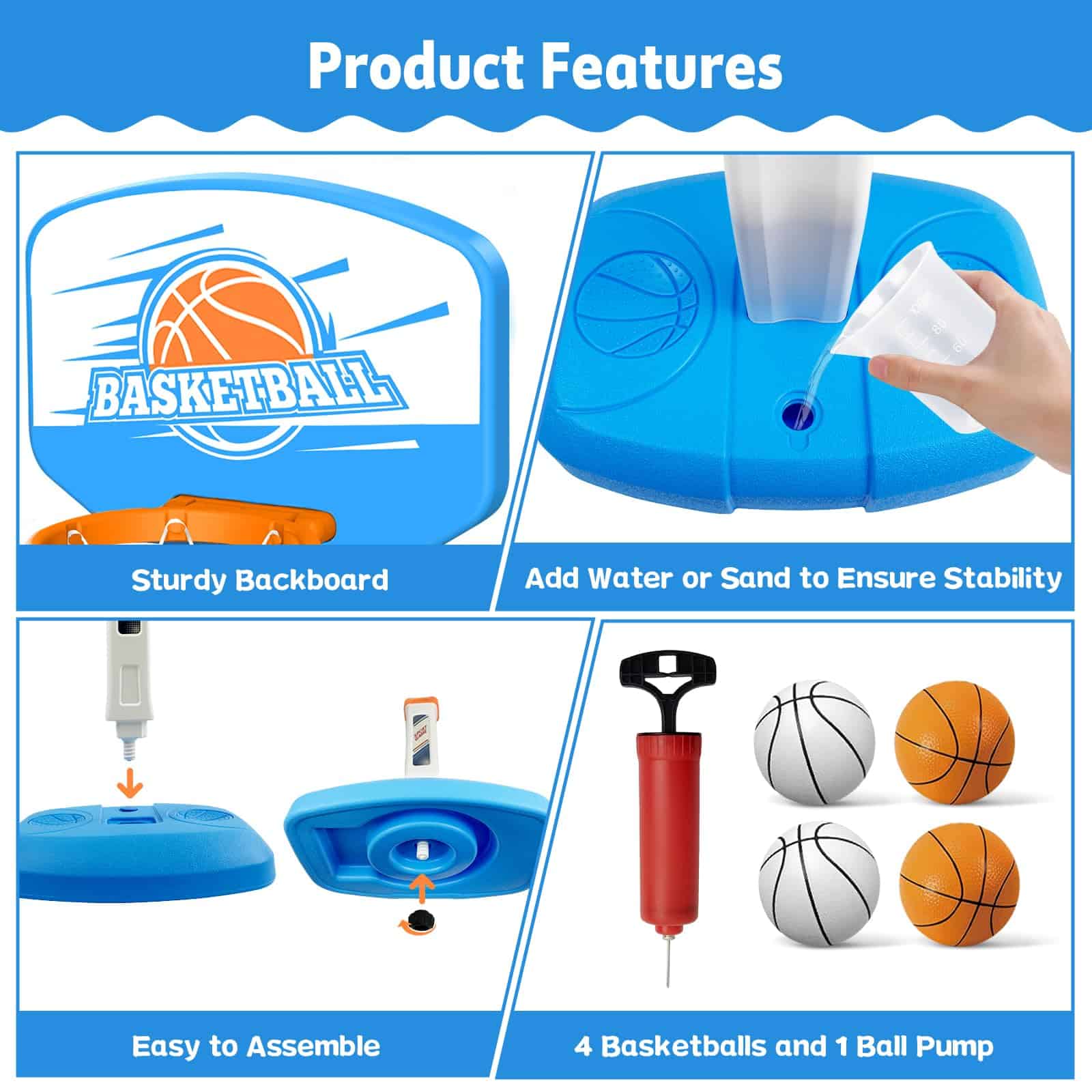4. Fácil de Montar – Este conjunto de aro de baloncesto para piscina incluye 1 aro de baloncesto, 4 balones de baloncesto inflables y 1 bomba de balón. Las instrucciones de montaje en la caja te ayudan a armarlo fácilmente sin necesidad de herramientas.