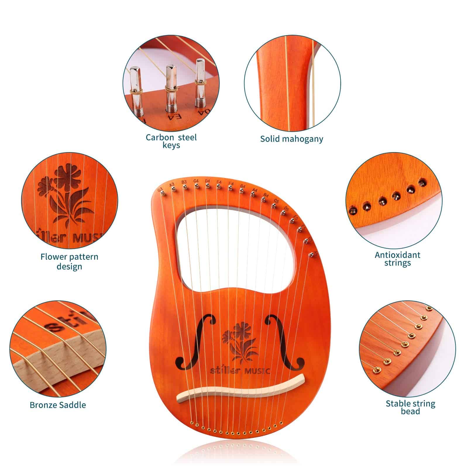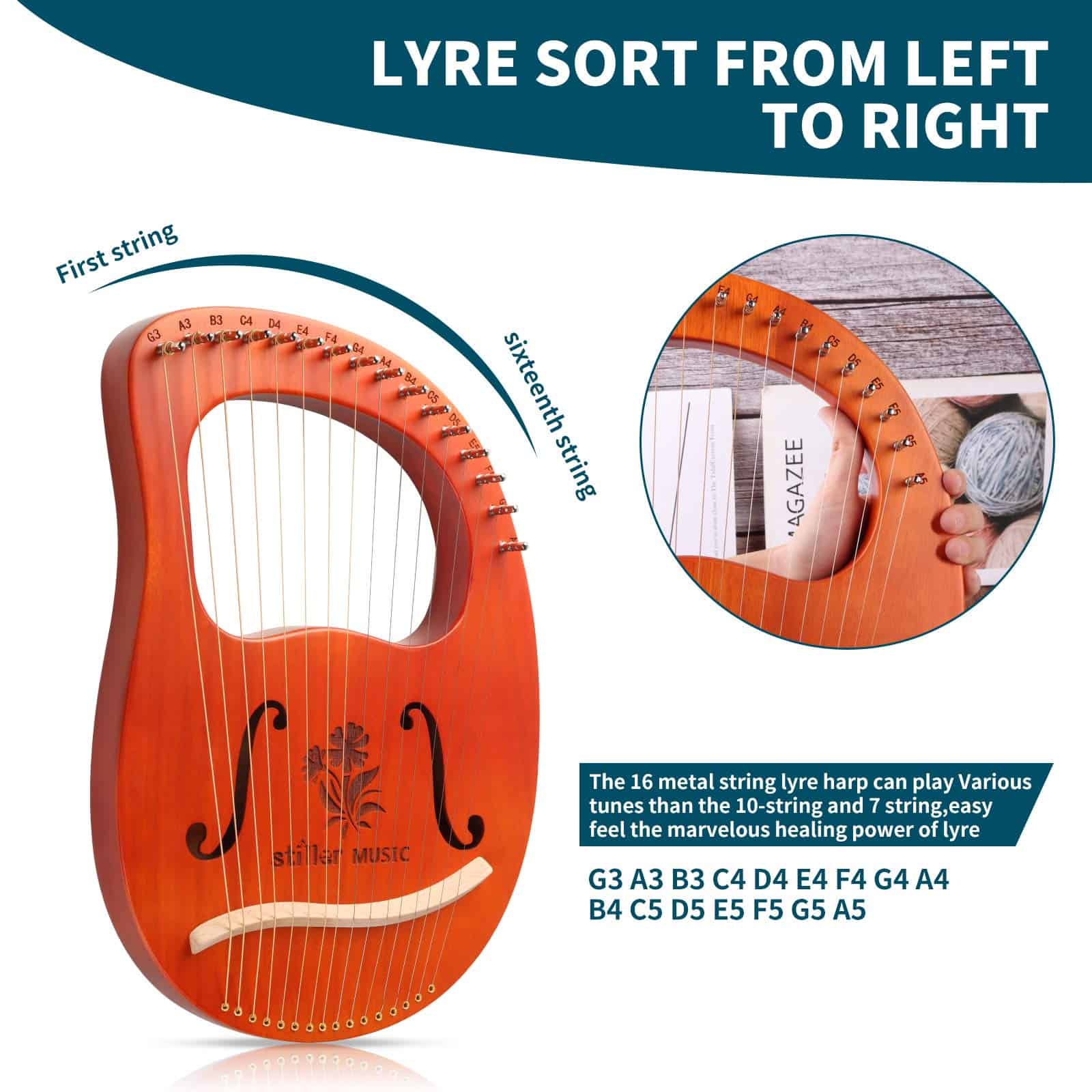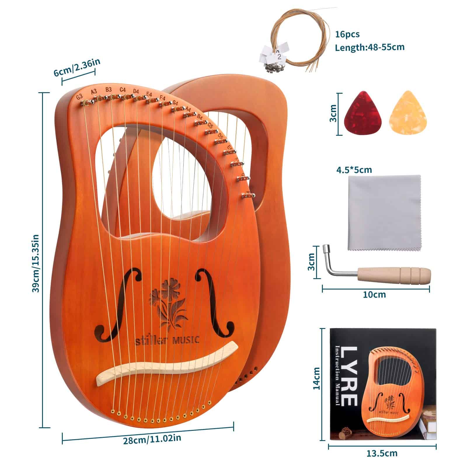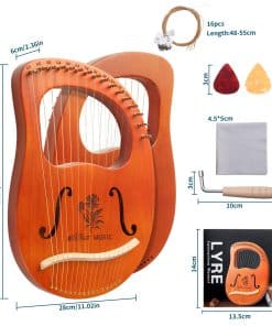 1. Diseño mejorado de 16 cuerdas: El arpa de lira está diseñada con 16 cuerdas, cuerdas de acero de alta calidad que no dañan las manos :1 (G3),2 (A3),3 (GB3),4 (C4),5 (D4),6 (E4),7 (F4),8 (G4),9 (A4), 10 (B4),11 (C5),12 (D5),13 (E5),14 (F5),15 (G5),16 (A5). 2. Calidad premium en madera: Seleccionada caoba de alta calidad con grano de madera perfecto, poros y densidad de madera para garantizar un excelente tono cálido y sostenido. 3. Tamaño adecuado y ligero: Tamaño: 15.35 x 11.02 x 2.36 pulgadas, peso: 2.9 libras. El tamaño se ajusta al cuerpo del músico y la distancia entre las cuerdas se adapta al tamaño de la mano de juego. 4. Instrumento de sanación del alma: Cuando tocas suavemente una cuerda, resonará para producir un sonido continuo, cálido y puro. Sus áreas de aplicación son principalmente en presentaciones, sanación y enseñanza, amantes de la música, etc. 5. Kit completo de arpa de lira: Viene con un arpa de lira, una llave de afinación, 16 cuerdas adicionales, 1 paño limpio, 2 púas. Comienza fácilmente a practicar el aprendizaje de la lira.