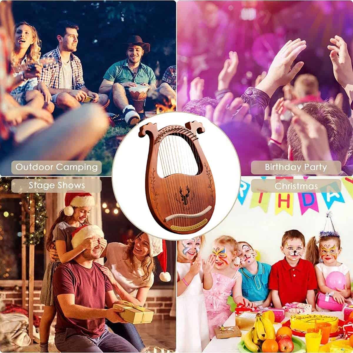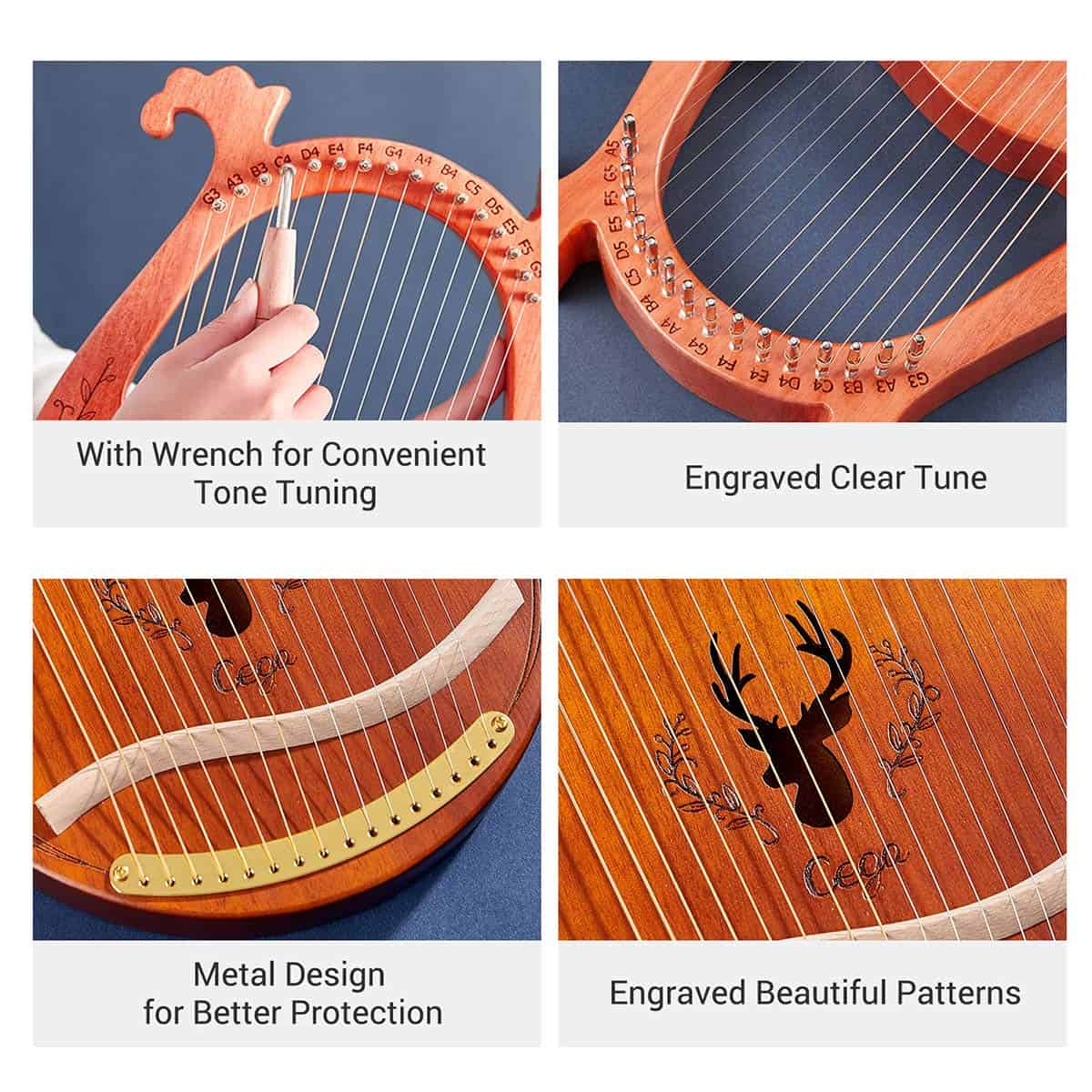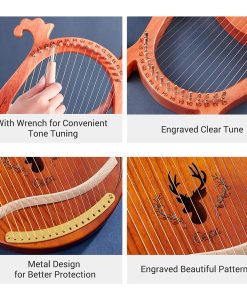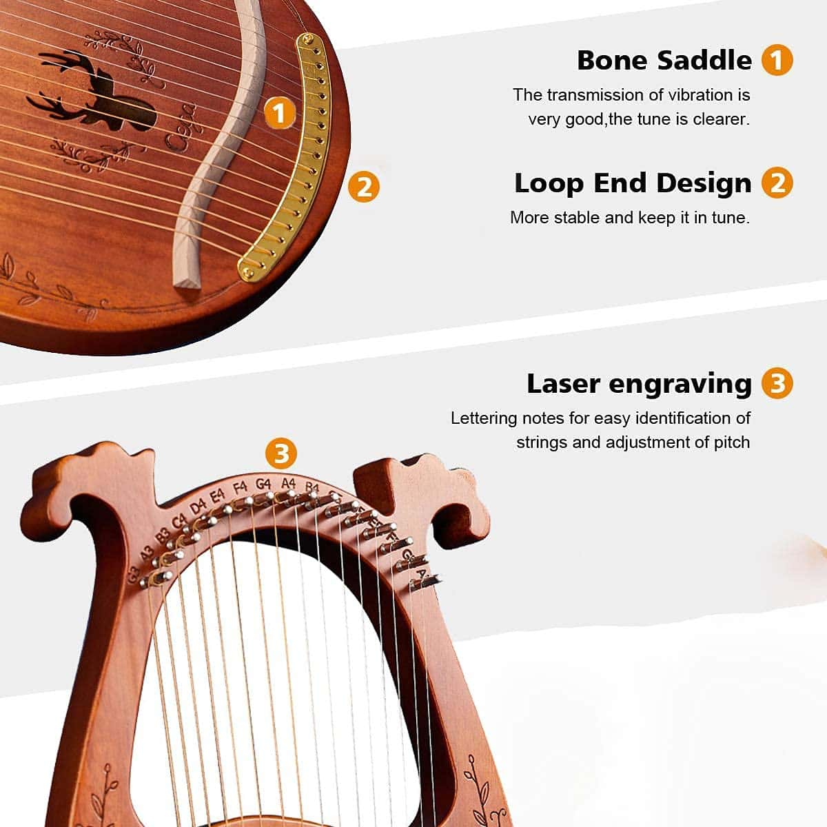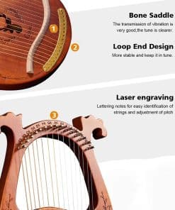 1. HECHO DE CAOBA: El arpa de lira tallada a partir de una sola pieza de caoba, puede hacer que el sonido sea más rico y complejo, y tenga mayor claridad y resonancia. El instrumento tiene una voz cálida con un tono agradable. El cuerpo de madera maciza de caoba adopta un diseño cónclave especial con una superficie lisa y una mano de obra exquisita. La madera con alta dureza y alta densidad es suficiente para mantener el tono de color. 2. 16 CUERDAS DE ACERO: Arpa de Lira de 16 Cuerdas de Madera con Cuerdas de Metal Instrumento. Necesita ajustarse repetidamente, suena la campana y puede llenar toda la habitación. Cuanto más corta es la cuerda, más alto es el tono que obtienes. Lo mismo es cierto para la tensión de la cuerda. 3. Instrumento del Alma Sanador Cuando pellizcas suavemente una cuerda, resonará para producir un sonido continuo, cálido y puro. Sus áreas de aplicación son principalmente en la actuación, la curación y la enseñanza, amantes de la música, etc. 4. VARIOS ACCESORIOS: El kit de iniciación proporciona todo lo que necesitas, como bolsa de piano, cuerdas adicionales, llave de afinación, tutorial de música en inglés, púas. Es más adecuado para tus necesidades para llevarte la música contigo o almacenarla en casa. 5. REGALOS MARAVILLOSOS: El arpa de lira es relativamente ligera y se puede llevar a cualquier lugar con la bolsa de lira, lo que es adecuado para diversas reuniones o viajes para cultivar el estado de ánimo. Se puede utilizar en muchas ocasiones. Es el mejor regalo para niños, adultos, bandas y profesionales, será adecuado para principiantes y profesionales.