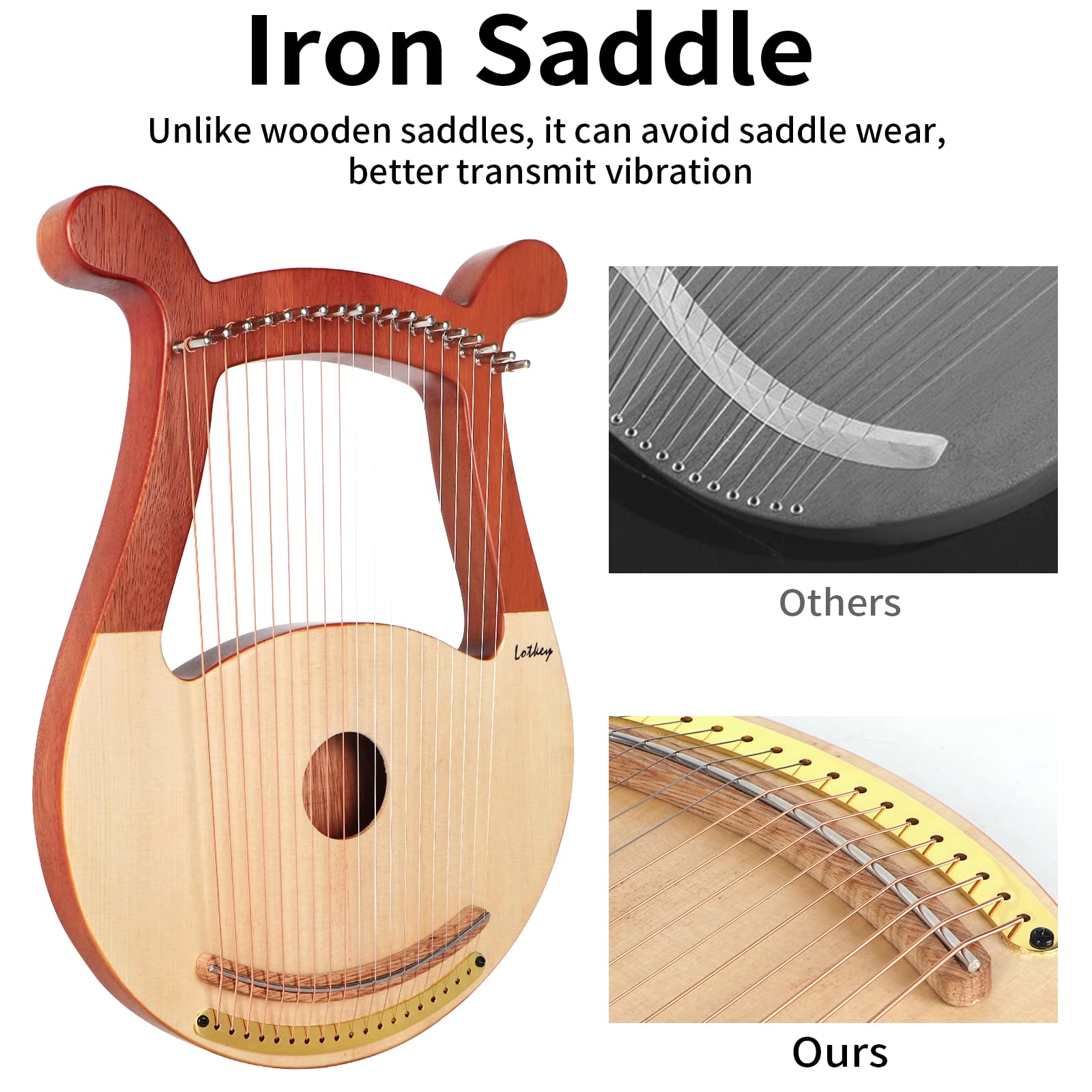 1. Calidad Premium – Este instrumento de arpa está hecho de caoba maciza, abeto macizo y teclas de hierro. Tiene un sonido claro y suave y un hermoso diseño. 2. Diseño Actualizado – En comparación con la silla de madera, la silla de hierro que utilizamos puede transmitir mejor la vibración y evitar el desgaste de la silla, lo que permite que nuestra arpa de lira se use durante más tiempo. 3. Diseño de 19 cuerdas – 1 (F3), 2 (G3), 3 (A3), 4 (B3), 5 (C4), 6 (D4), 7 (E4), 8 (F4), 9(G4), 10 (A4), 11 (B4), 12 (C5), 13 (D5), 14 (E5), 15 (F5), 16 (G5), 17 (A5), 18 (B5), 19 (C6). El arpa de 19 cuerdas tiene más escalas y proporciona tonos más ricos. Viene con un juego de cuerdas y una llave especial para ajustar el tono de cada cuerda. Consejo: Puede usar un martillo pequeño para golpear ligeramente la llave, de modo que logre un efecto de afinación fina. 4. Sonido Puro – Cuando golpeas suavemente una cuerda, crea un efecto de silbido continuo en el espacio, que puede relajar nuestro cuerpo y mente. 5. Bonito Regalo – Este arpa de lira con forma de oso viene con un juego de cuerdas de repuesto, una llave de afinación, una bolsa de transporte negra e instrucciones. Es fácil de llevar o almacenar, adecuado tanto para principiantes como profesionales. 6. Consejos de Afinación – Se necesitan varias afinaciones para que las cuerdas nuevas ajusten su tono. Para cuerdas agudas, intenta girar ligeramente la llave y afinar suavemente. Viene con cuerdas de repuesto para principiantes en arpa de lira. Si tienes algún problema de afinación, no dudes en contactarnos en nuestra tienda, lo resolveremos de inmediato. 7. Servicio Postventa – ¡Esperamos brindarte una maravillosa experiencia de compra! Si hay alguna pregunta con el artículo que recibiste, contáctanos en nuestra tienda.