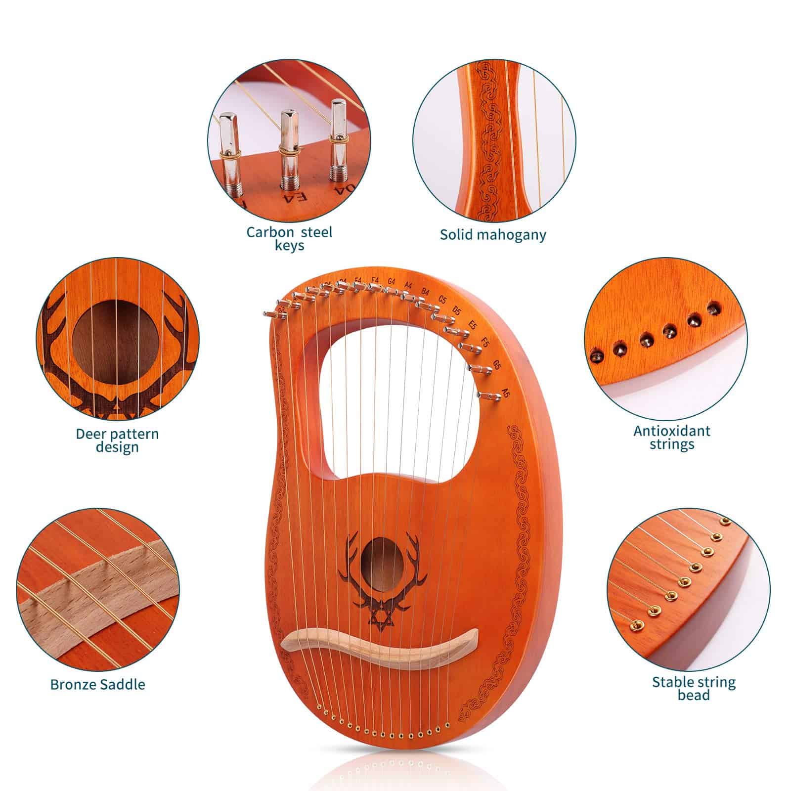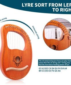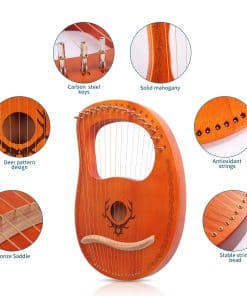 1. Kit completo de arpa lira que incluye un arpa lira, una llave de afinación, cuerdas adicionales, 1 paño limpio, 2 púas. Comienza fácilmente a practicar el aprendizaje de la lira. 2. Madera de alta calidad seleccionada de caoba de alta calidad con vetas de madera perfectas, poros y densidad de madera para garantizar que nos brinde un tono cálido y una buena sostenibilidad. El arpa está grabada con un diseño de ciervo y es popular entre los jóvenes. 3. Tamaño adecuado y ligero Tamaño: 15.35 11.02 2.36in, peso: 2.9LB. El tamaño se adapta al cuerpo del jugador, y la distancia entre las cuerdas coincide con el tamaño de la mano que toca. 4. Instrumento sanador del alma Cuando pellizcas suavemente una cuerda, resonará para producir un sonido continuo, cálido y puro. Sus áreas de aplicación son principalmente en interpretación, curación y enseñanza, amantes de la música, etc. 5. Kit completo de arpa lira que incluye un arpa lira, una bolsa de almacenamiento, una llave de afinación, cuerdas adicionales, 1 paño limpio, 2 púas. Comienza fácilmente a practicar el aprendizaje de la lira.
