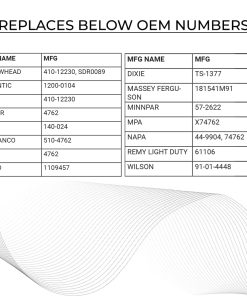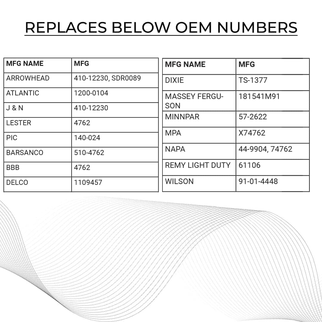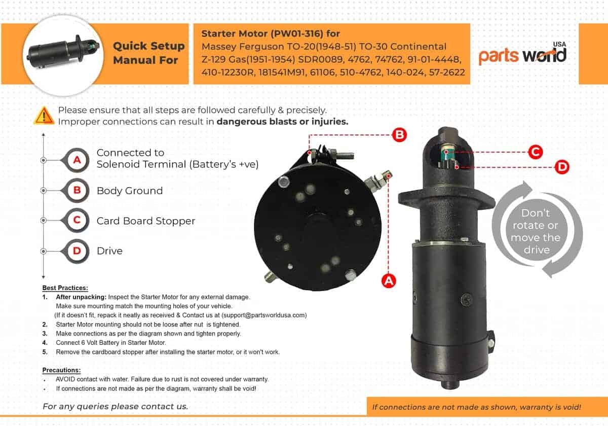 El arrancador de 6 voltios de PARTS WORLD USA es de alta calidad y ayuda a que sus vehículos funcionen de manera suave y rápida. Se ajusta a tractores MASSEY FERGUSON, DELCO, ARROWHEAD. Este arrancador es compatible con tractores Massey Ferguson TO-20 (1948-1951) y TO-30 Continental Z-129 Gas (1951-1954). Ofrecemos un soporte de 1 año sin problemas en nuestros productos y servicio al cliente dedicado.