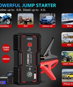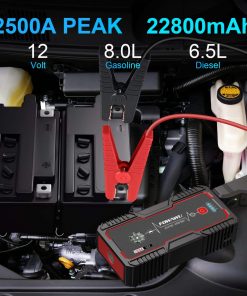 1. Arrancador de coche de gran capacidad con capacidad de 20800mAh y potente corriente máxima de arranque de 2500A, puede arrancar vehículos de 12V (hasta motores de gasolina de 8L o diésel de 6.5L) fácilmente. Apto para coches, camiones, motocicletas, embarcaciones, cortadoras de césped, yates, camionetas, motos de nieve, etc. Compacto suficiente para almacenar en su guantera o debajo del asiento.