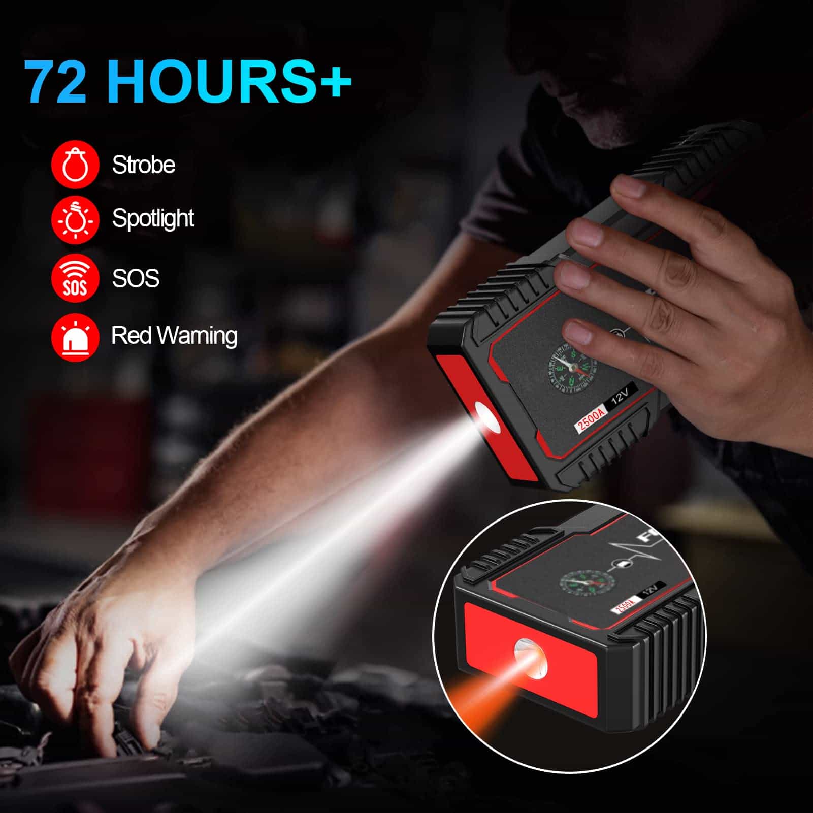 4. LINTERNA LED DE EMERGENCIA El paquete de batería de arranque está equipado con 4 modos de luz LED (iluminación/SOS/estroboscópica/advertencia), proporcionando más comodidad en el uso nocturno. Esta linterna multifuncional es ideal para acampar, al aire libre, emergencias, viajes, etc.