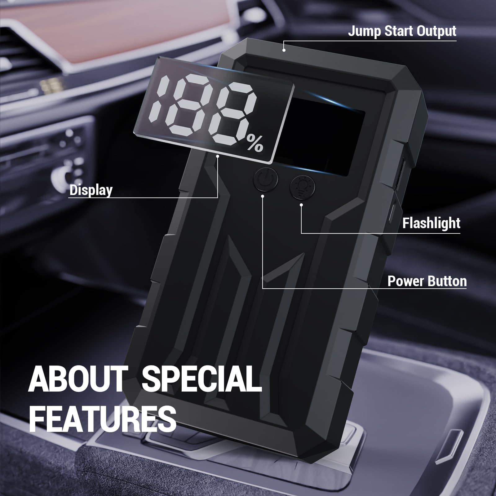 2. Pantalla de Detección Inteligente: Equipado con una gran pantalla inteligente para un uso fácil, este arrancador de coche portátil puede detectar e indicar de manera inteligente el voltaje de la batería y la carga restante en tiempo real, para que todo se pueda ver de un vistazo.