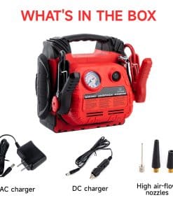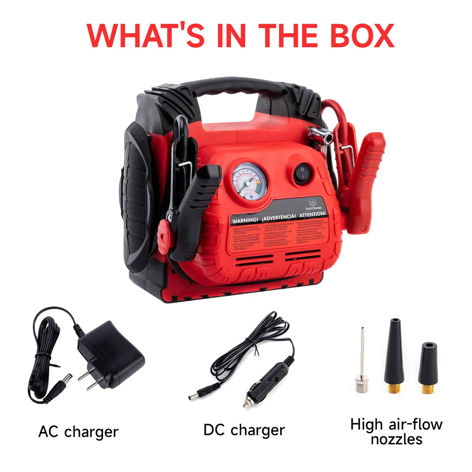 5. Lo que obtienes—1 arrancador de batería con compresor de aire, 1 cargador de CA, 1 cargador de CC, 3 Boquillas de aire, 1 Guía del usuario. Contáctanos en cualquier momento si hay algún problema con el paquete de arrancador de batería. Te ayudaremos a resolverlo lo antes posible. ¡Deseamos que disfrutes con este arrancador, siéntete libre en el camino siempre!