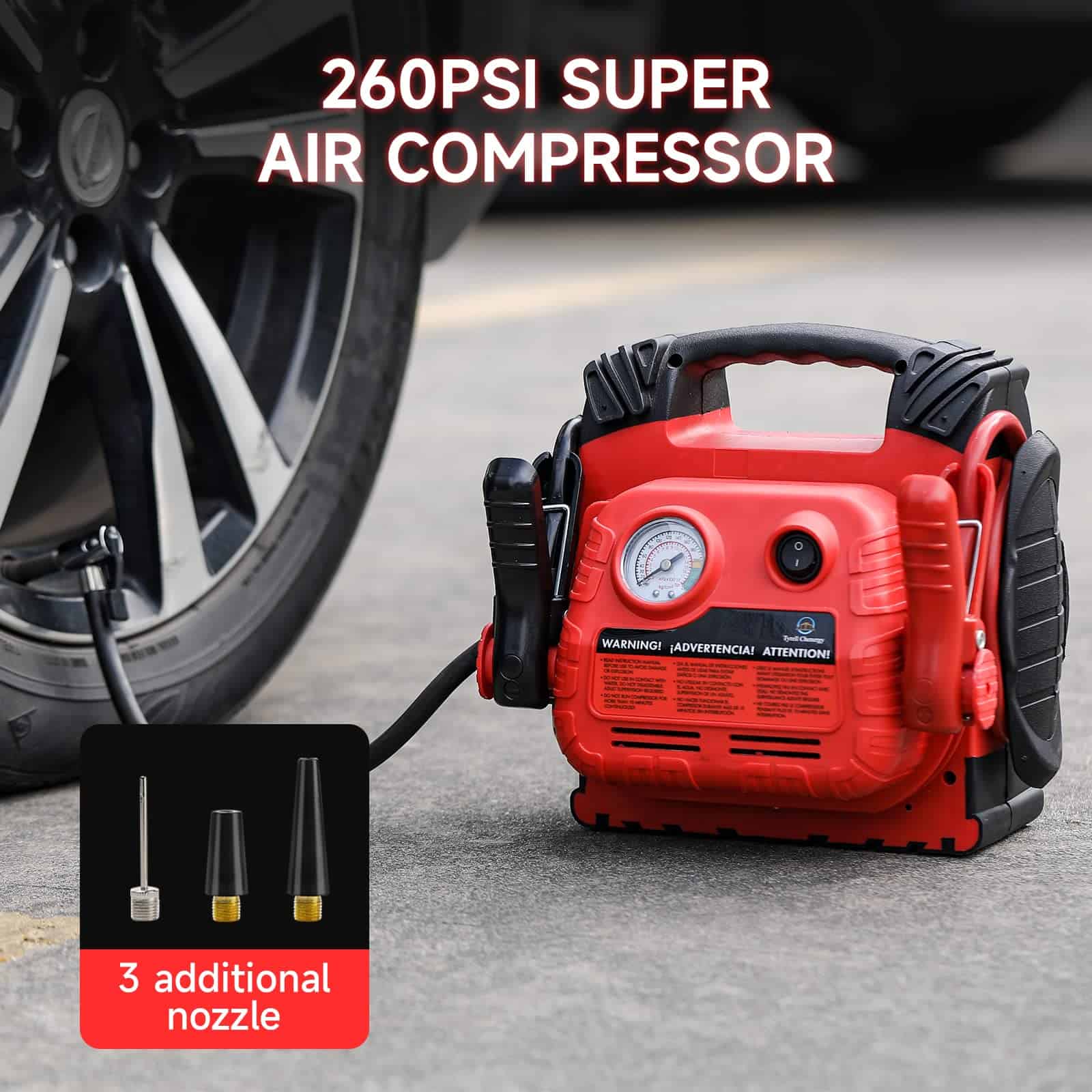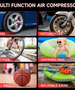 2. Bomba de aire de emergencia—¡proporciona una presión máxima de 260 PSI y un flujo de aire de 38 L/min! ¡Toma de 3 a 5 minutos inflar un neumático de automóvil regular a 30 PSI, perfecto para motocicletas, bicicletas y otros vehículos. Además, con los 3 accesorios de alta flujo de aire proporcionados, también puedes inflar balones, kayaks inflables, colchones de aire y otros inflables.