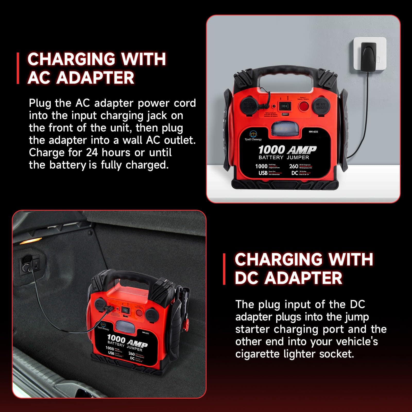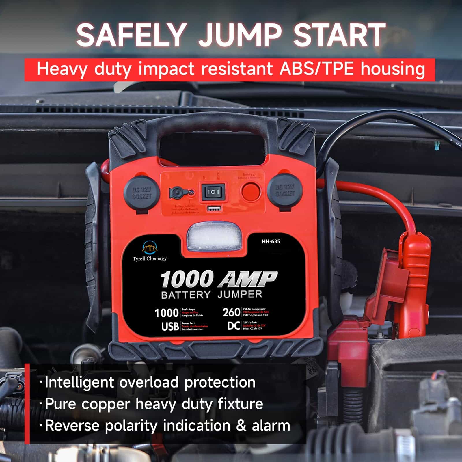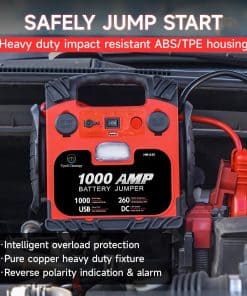 1. Arrancadores inteligentes—Diseñado para autos de 12V, los 1000 amperios de pico satisfacen (Motor de 5L de Gasolina o 5L de Diésel). Con protección de sobrecarga inteligente, pinza robusta de cobre puro, indicación de polaridad invertida y diseño de alarma, garantiza tu seguridad.