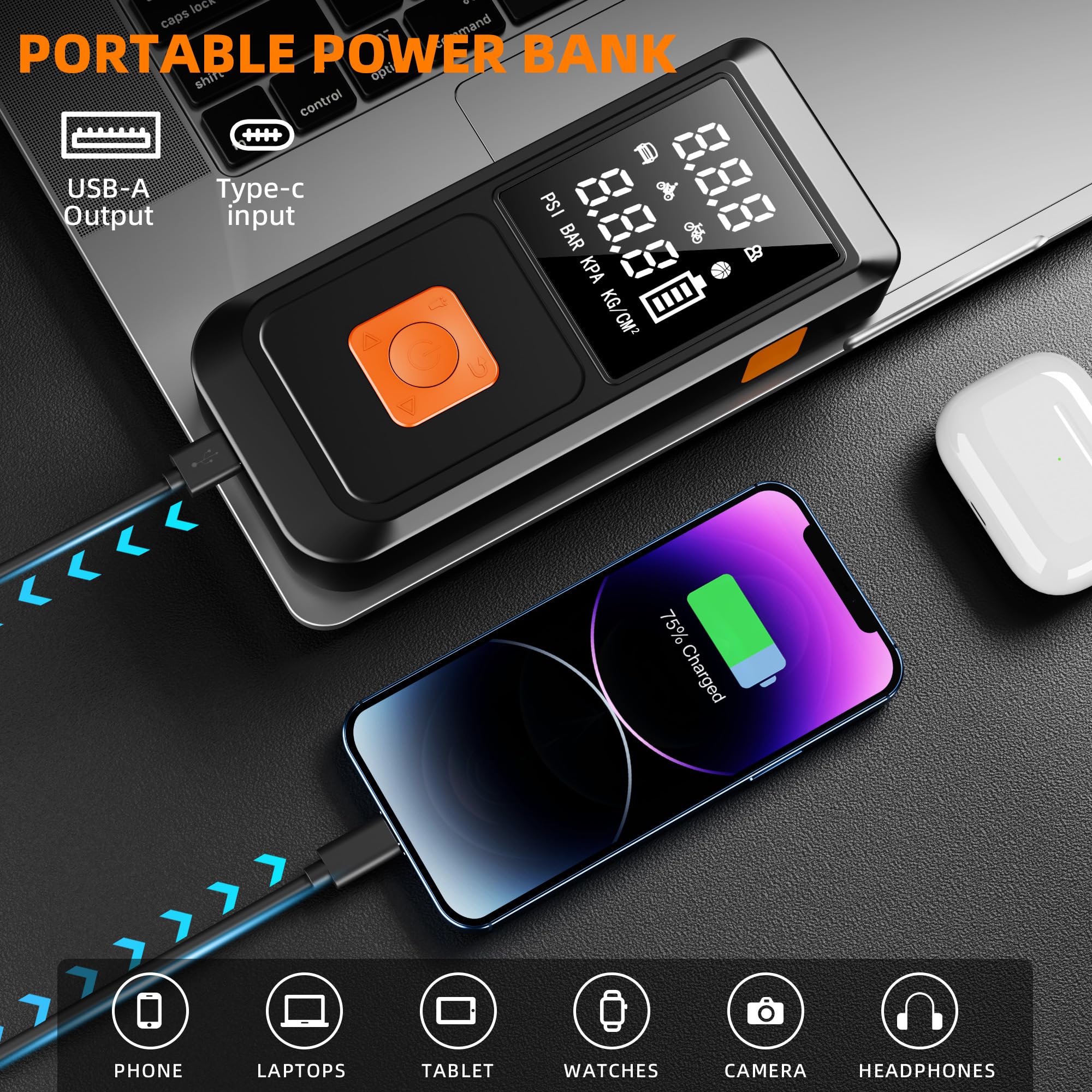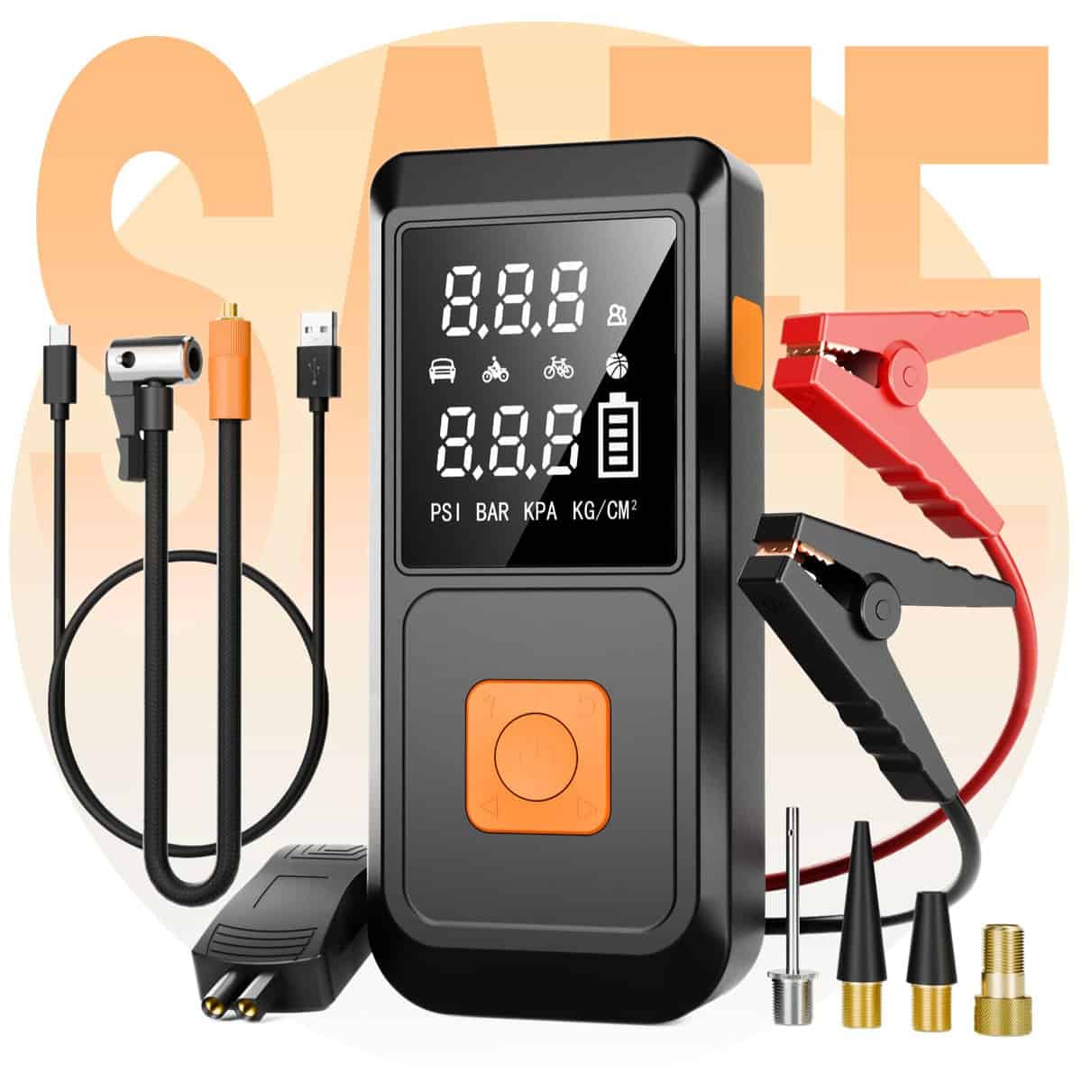 4. ARRANCADOR DE BATERÍA PORTÁTIL TODO EN UNO Este arrancador de batería portátil combina perfectamente 7 funciones esenciales: un arrancador de batería portátil para automóvil, un inflador de neumáticos, un medidor de presión, 3 modos de luz (linterna, advertencia SOS, estroboscópica) y un banco de energía de 20000mAh (puertos USB para cargar dispositivos móviles). Y este arrancador de batería para automóvil portátil es más ligero que los viejos y voluminosos paquetes de arranque, puede guardarse fácilmente en su automóvil y llevarlo a donde quiera que vaya.