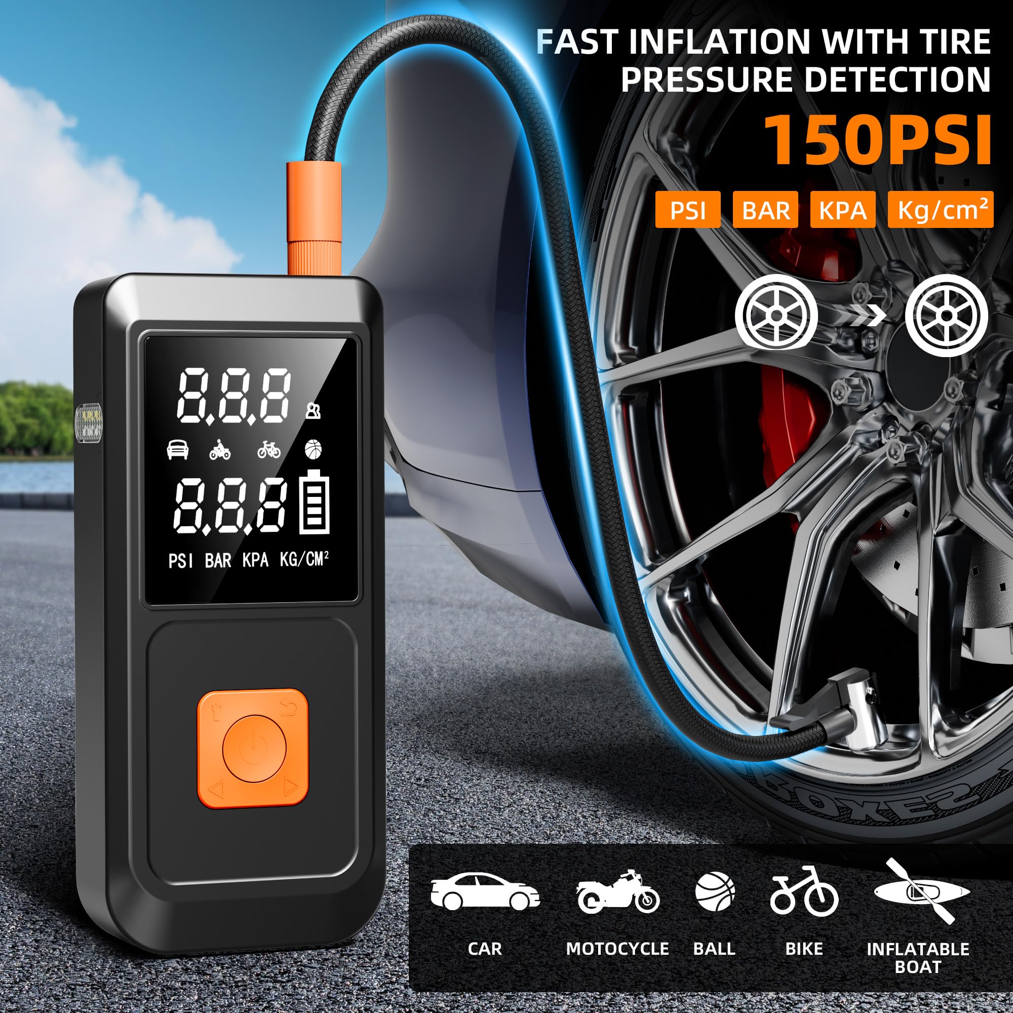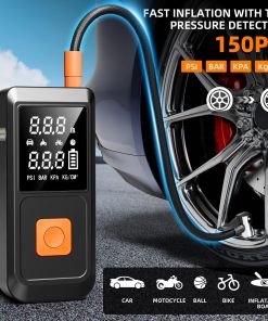 2. COMPRESOR DE AIRE INALÁMBRICO CON CHIP INTELIGENTE PARA INFLADO Este arrancador de batería portátil de 150 PSI con compresor de aire está equipado con un medidor de presión digital integrado y parada automática de inflado. El cilindro turboalimentado único ofrece una rápida tasa de inflado de 30 L/min, inflando un neumático de coche (0-36 PSI) en 5 minutos. Una carga completa soporta hasta 8 neumáticos de coche desinflados.