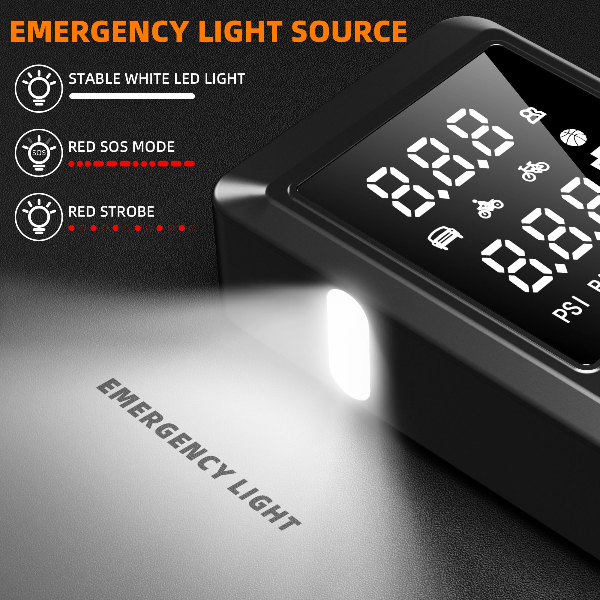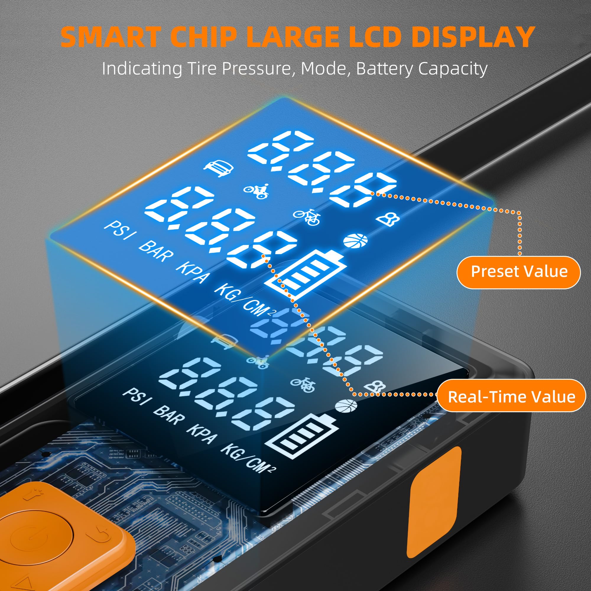 3. GRAN PANTALLA LCD PARA OPERACIÓN INTUITIVA Este inflador de neumáticos y arrancador de batería está equipado con una pantalla LCD ultra grande, que indica los 5 modos preestablecidos (coches, motocicletas, bicicletas, pelotas y personalización) y 4 unidades seleccionables (PSI, KPA, BAR, Kg/cm). Se pueden usar 4 boquillas diferentes para inflar coches, motocicletas, bicicletas, pelotas, colchonetas flotantes y más. La pantalla ultra brillante se mantiene perfectamente legible en la luz solar más intensa.