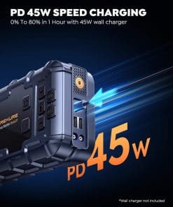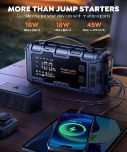 4. CARGA RÁPIDA DE 45W+18W Con la tecnología de carga bidireccional PD45W USB-C IN/OUT, el arrancador de batería se carga en solo 1 hora del 0% al 80%, y puede funcionar en tan solo 5 minutos. Carga tu teléfono hasta 4 veces más rápido, soportando portátiles. Satisface las mismas necesidades pero con un menor consumo de energía en comparación con 65W. 2 salidas USB rápidas de 18W adicionales cargan fácilmente múltiples dispositivos al mismo tiempo a velocidades óptimas. El cargador de batería para coche arrancador es perfecto para tu estilo de vida en movimiento.