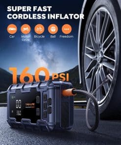 3. INFLADOR INALÁMBRICO 5+4+3 DE 160PSI Y PANTALLA INTELIGENTE DE 3,3″ Fácil de usar, preset inteligente, detección de presión y apagado automático. Con un mayor turbo de 45L/Min que dura 35 minutos, el arrancador de batería para coche portátil llena rápidamente un neumático a 25 PSI en solo 2 minutos. 5 modos de inflado (MÁX 160PSI, con memorización automática de parámetros), 4 unidades opcionales y 3 boquillas para aplicaciones amplias (coches, motocicletas, bicicletas, pelotas, etc.). La gran pantalla integral y visible a la luz del sol muestra datos en tiempo real y precisión de 1 PSI. Sin adivinanzas y sin sobrellenado!.