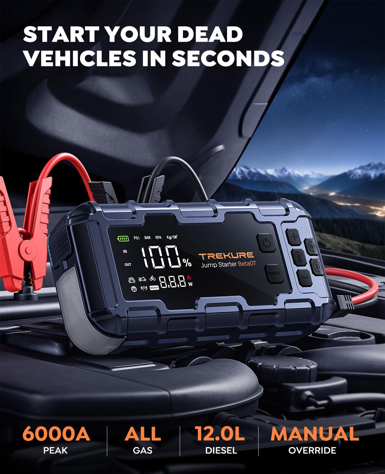 7. SOPORTE POSVENTA Los cables de arranque TREKURE con la batería están comprometidos a brindarte un viaje por carretera más seguro. Ofrecemos 2 años de devoluciones sin problemas y soporte técnico de por vida. Esperamos que nunca lo necesites, pero si lo haces, no dudes en contactarnos y haremos todo lo posible para solucionarlo. ¡Sal a la carretera rápidamente y de manera económica con tranquilidad.