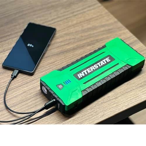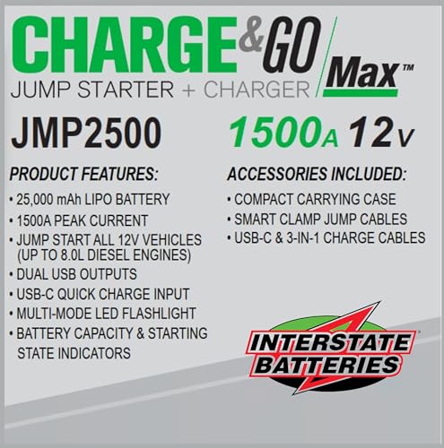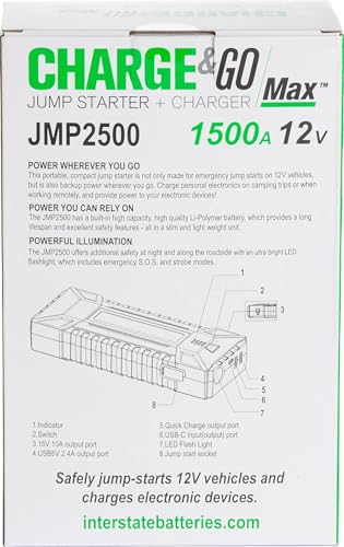 El arrancador de batería portátil y compacto de Interstate no solo está diseñado para arranques de emergencia en vehículos de 12 voltios, sino que también es una fuente de energía de respaldo donde quiera que vayas. Carga dispositivos personales electrónicos en excursiones de camping o cuando trabajas de forma remota, ¡y proporciona energía a tus dispositivos electrónicos! CARACTERÍSTICAS DEL PRODUCTO: BATERÍA LIPO DE 25,000 mAh CORRIENTE DE ARRANQUE DE PICO DE 1500A ARRANCA TODOS LOS VEHÍCULOS DE 12V (HASTA MOTORES DIÉSEL DE 8.0L) SALIDAS USB DUALES ENTRADA DE CARGA RÁPIDA USB-C LINTERNA LED MULTIFORMATO INDICADORES DE CAPACIDAD DE BATERÍA Y ESTADO DE ARRANQUE ACCESORIOS INCLUIDOS: ESTUCHE DE TRANSPORTE COMPACTO CABLES DE PINZA INTELIGENTES USB-C Y CABLES DE CARGA 3 EN 1 El JMP1700 tiene una batería integrada de alta capacidad y alta calidad de polímero de litio, que proporciona una larga vida útil y excelentes características de seguridad, todo en una unidad delgada y liviana. Ofrece seguridad adicional por la noche y en la carretera con una linterna LED ultrabrillante, que incluye modos de emergencia S.O.S. y estroboscópico.