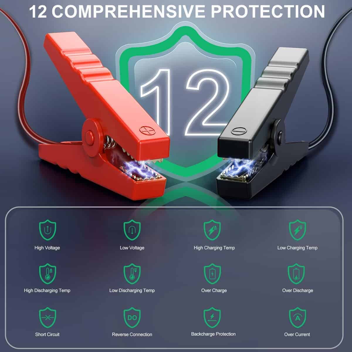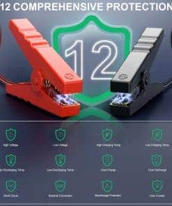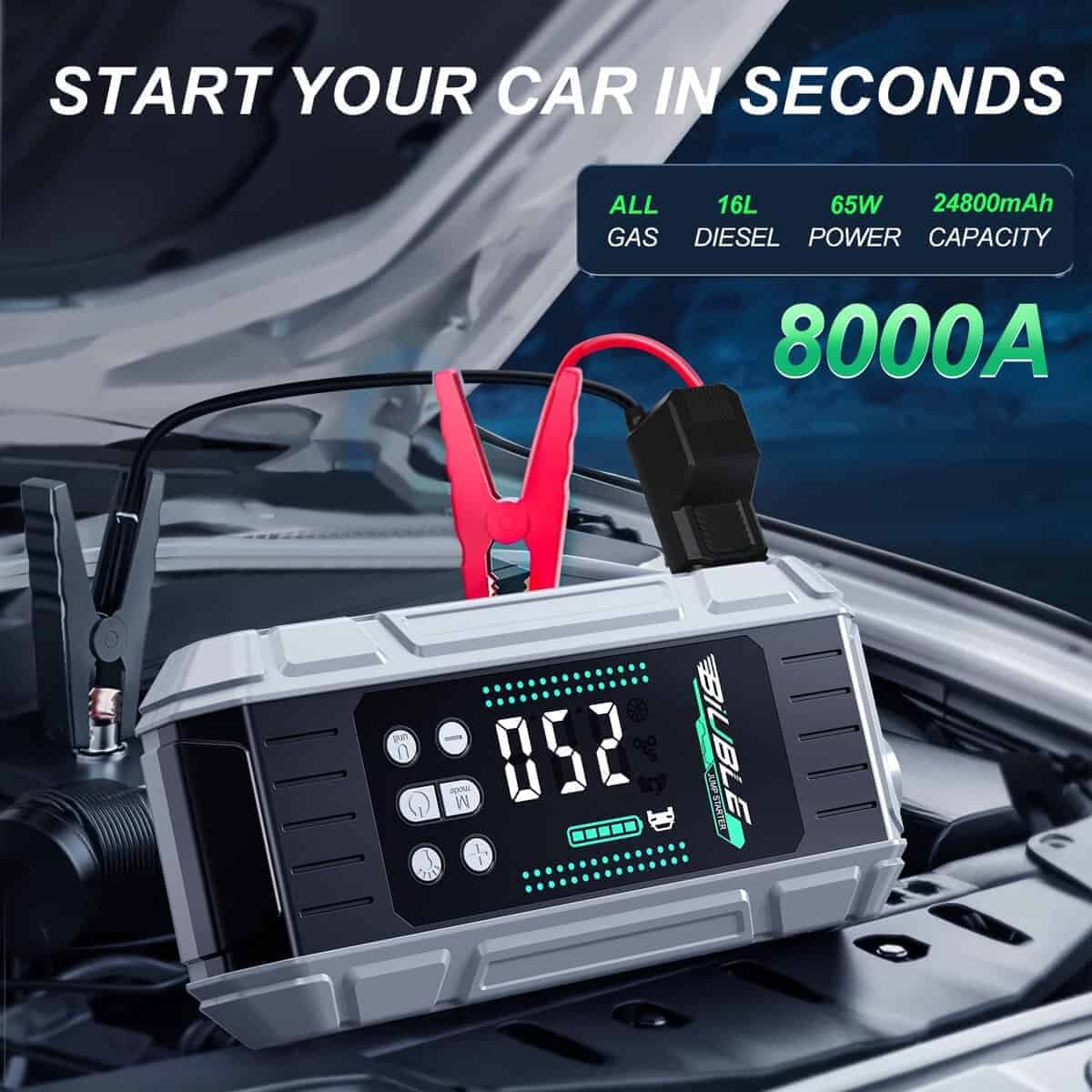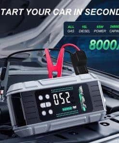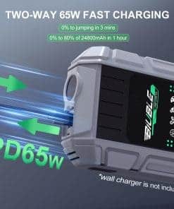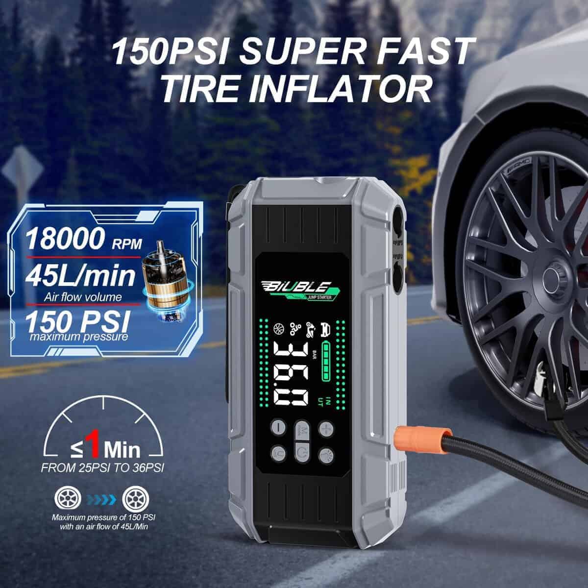 El arrancador de batería de coche más nuevo con 8000A de corriente máxima para todo gas/16L diesel, carga rápida PD de 65W en ambas direcciones, compresor de aire de 150 PSI, soplador de 450L/min para inflables, 24800mAh de alta capacidad, cable de arranque inteligente, pantalla LCD inteligente, 3 modos de luces, en espera durante más de 24 meses. Nuestro arrancador de batería de coche puede arrancar instantáneamente sus vehículos varados (hasta todo gas/16L diesel) incluso a -20 °C, incluidas las baterías completamente agotadas. Inflado de neumáticos rápido de 1 minuto: nuestro arrancador de coche con compresor de aire está diseñado con ajuste preestablecido inteligente y apagado automático. El paquete de arranque cuenta con una presión de 150 PSI y un flujo de aire de 45L/min, tardando solo 1 minuto en rellenar neumáticos en situaciones diarias (25-36 PSI). Amplias aplicaciones (coches, motocicletas, bicicletas, pelotas, etc). Función de soplador para inflables: nuestra caja de arranque cuenta con una función de soplador única, que viene con una manguera de diámetro más grande y una serie de adaptadores de válvula, especialmente diseñados para inflar flotadores de piscina, colchones de aire, anillos de natación y admitir el bombeo inverso para un almacenamiento rápido. Banco de energía QC3.0 de 24800mAh: el arrancador de batería de coche portátil de 24800mAh cuenta con 1 puerto USB de carga rápida y 1 puerto tipo C de entrada/salida compatible con casi todos los dispositivos. El último chip minimizará la autodescarga, admite más de 2000 ciclos de recarga y en espera durante más de 24 meses. 12 protecciones para su seguridad: el arrancador portátil de coche BIUBLE adopta un cable de arranque inteligente que cuenta con abrazaderas de alta resistencia de mejor conductividad y agarre ergonómico, y ejecuta automáticamente 12 protecciones para protegerlo a usted y a las baterías de cualquier operación indebida. Excelente servicio al cliente: los equipos de BIUBLE están dedicados a brindar el mejor servicio al cliente. Disfrutará de una garantía de 12 meses y soporte técnico de por vida en nuestro arrancador de batería. Si tiene alguna pregunta, no dude en contactarnos, le ayudaremos en 24 horas.