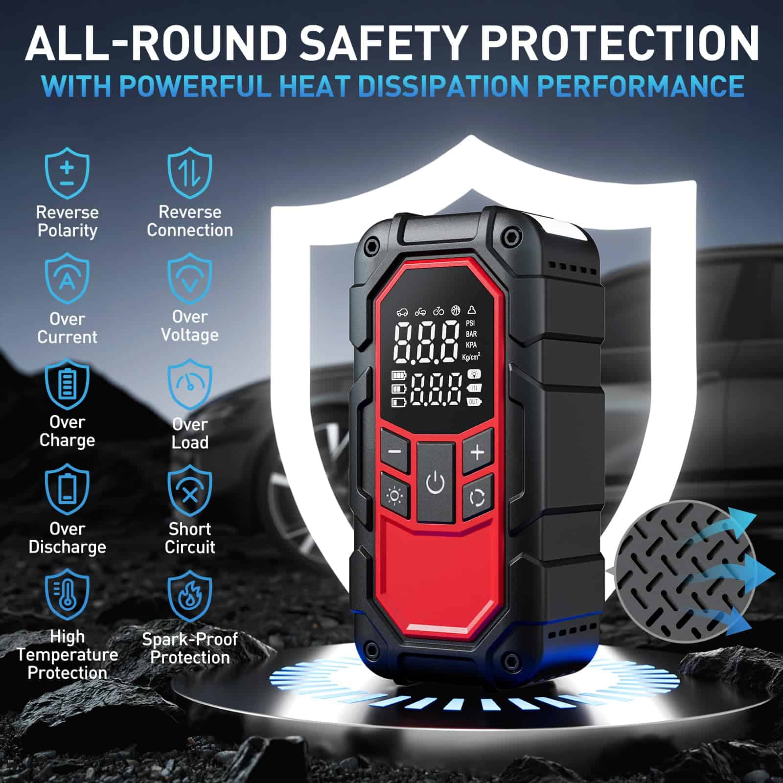 3. Protección de Seguridad Integral: El arrancador de coche con compresor de aire tiene un diseño único en forma de panal que le proporciona un rendimiento potente de disipación de calor, y cuenta con 10 tecnologías de protección de seguridad integradas (polaridad inversa, antichispas, cortocircuito, sobrecarga, sobrecorriente, baja temperatura, alta temperatura, sobretensión, sobrecarga, carga inversa). Los cables de arranque inteligentes para coche proporcionan detección automática de conexiones y alarmas en tiempo real para garantizar un funcionamiento sin chispas, lo que mejora en gran medida la seguridad de uso y prolonga la vida útil.