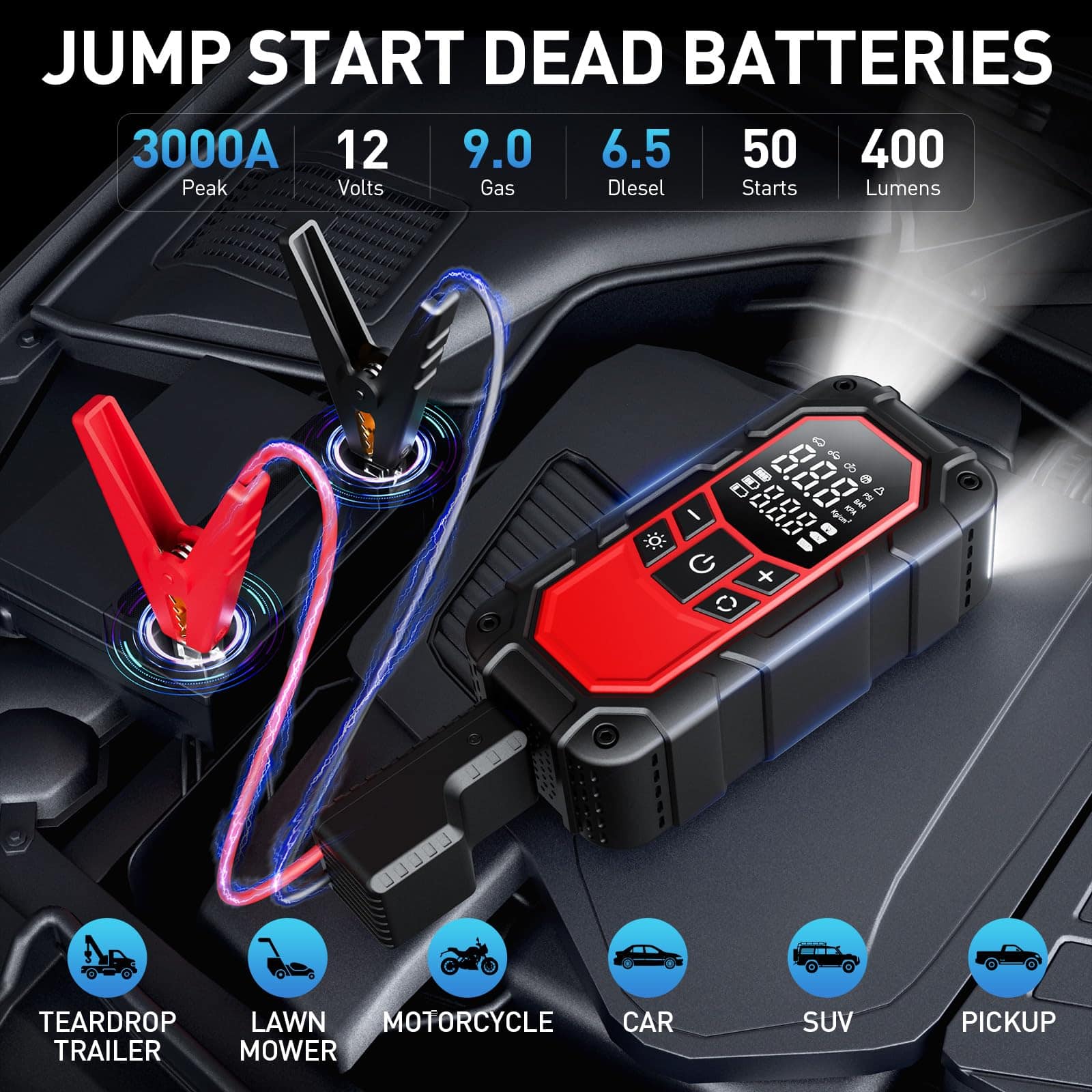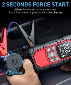 1. Potente Arrancador de Batería de Coche: El arrancador de coche puede arrancar de forma segura una batería de 12V muerta (hasta 9.0L de gasolina/6.5L de diésel) en segundos. Con una corriente de arranque mejorada de 3000A, el arrancador de coche portátil puede soportar más de 1000 ciclos de carga incluso en temperaturas extremas (-4 F a 140 F). Cuando se detecta que el voltaje de la batería de arranque es demasiado bajo, simplemente presione y mantenga presionado el botón de arranque forzado durante 2 segundos, el motor aún puede ser arrancado rápidamente mediante la fuerza, asegurando que siempre haya ayuda disponible para usted. Es compatible con automóviles, camiones, motocicletas, cortadoras de césped, SUV, motos de nieve, botes, etc.