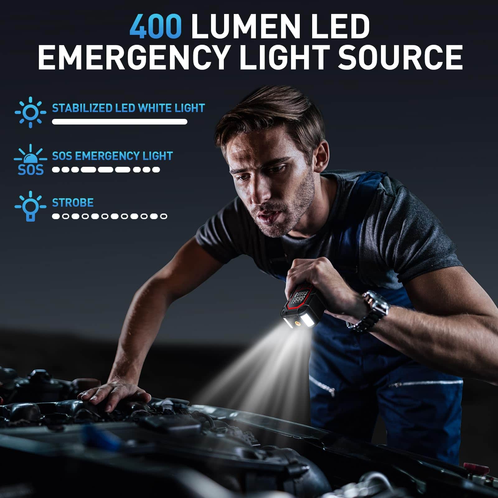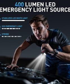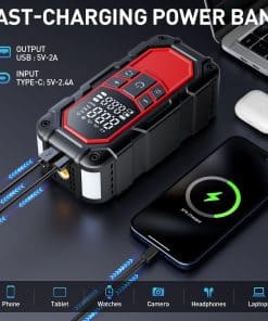 4. Multifuncional y Portátil: El arrancador de batería portátil integra 6 funciones prácticas para satisfacer todas sus necesidades, incluido el arrancador de coche, compresor de aire, luz LED de 400 lúmenes , 3 modos de luz (linterna, advertencia SOS, estroboscópica), puertos USB para cargar dispositivos móviles. Mide 3.03 2.24 6.41 pulgadas y pesa solo 1.3 libras, lo que facilita su almacenamiento en automóviles y bolsas de viaje.