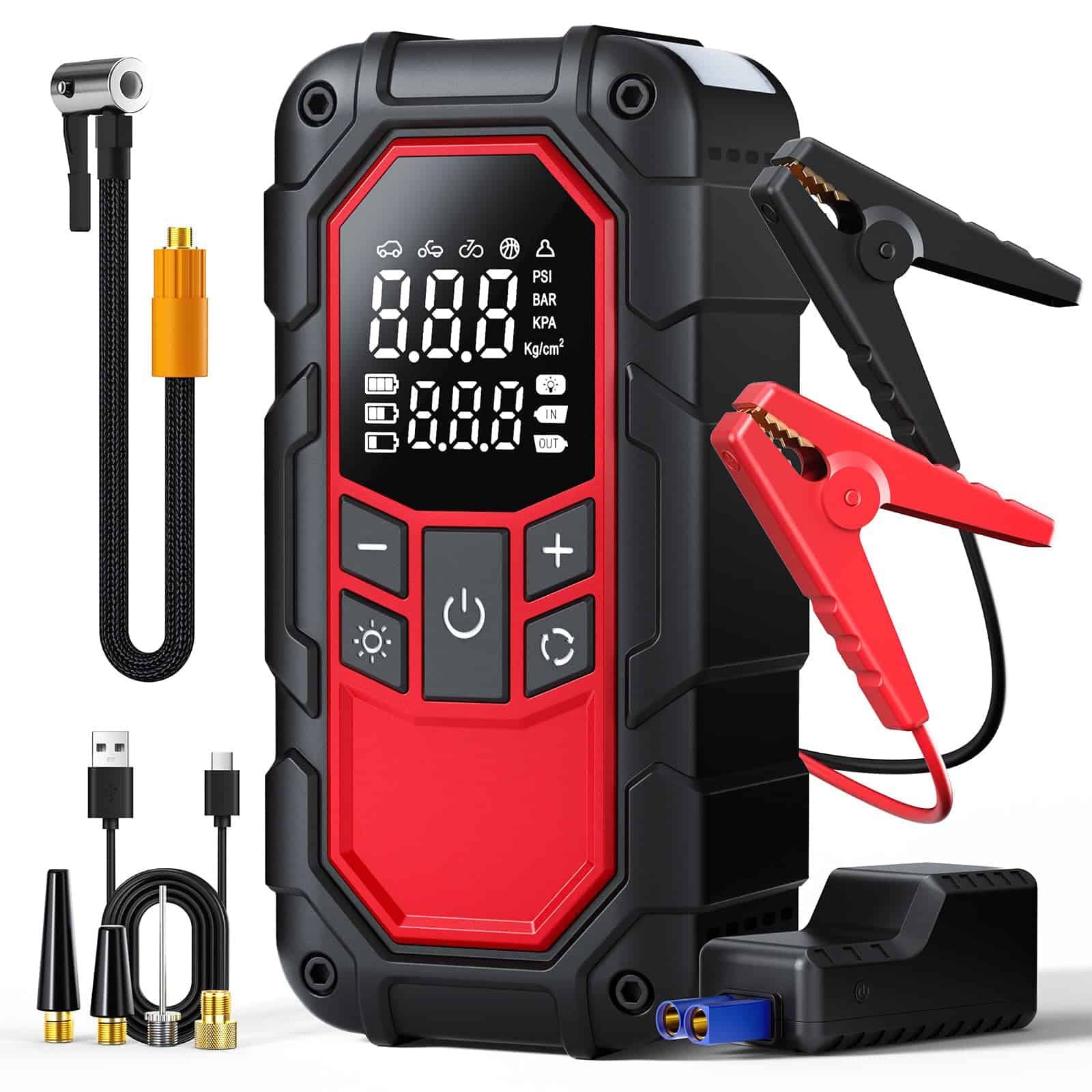 6. Lo que obtendrá: 1 Arrancador de emergencia portátil con compresor de aire, 1 cable de arranque inteligente, 1 cable de carga USB-C, 1 manguera de la bomba de aire, 4 boquillas de aire, 1 caja de almacenamiento portátil, 1 manual del usuario. Si tiene alguna pregunta, contáctenos, le atenderemos con todo el corazón, ¡gracias por su apoyo!