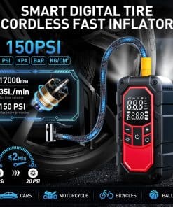 2. Inflador Inteligente de Neumáticos con Apagado Automático: El compresor de aire portátil de 150PSI tiene un medidor digital LCD incorporado y admite la función de monitoreo de la presión de los neumáticos. Puede preajustar inteligentemente el valor deseado (conmutador de 4 unidades PSI, BAR, KPA, KG/cm ), y se apagará automáticamente cuando se alcance la presión, sin ajustes e inspecciones repetidos. Está equipado con una manguera de aire extendida y 4 boquillas diferentes para inflar neumáticos de automóviles, motocicletas, bicicletas, pelotas y otros inflables. El sistema de turboalimentación único 35L/Min (150 PSI), puede inflar rápidamente los neumáticos del coche a 20 PSI en solo 2 minutos.