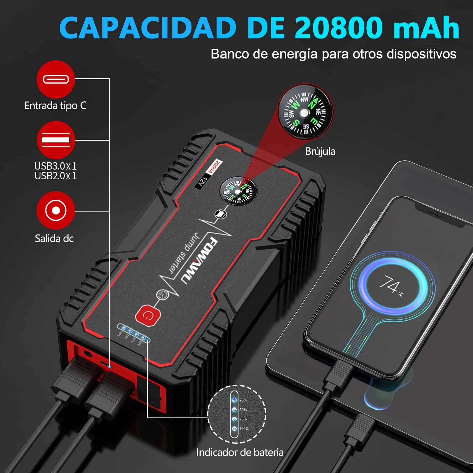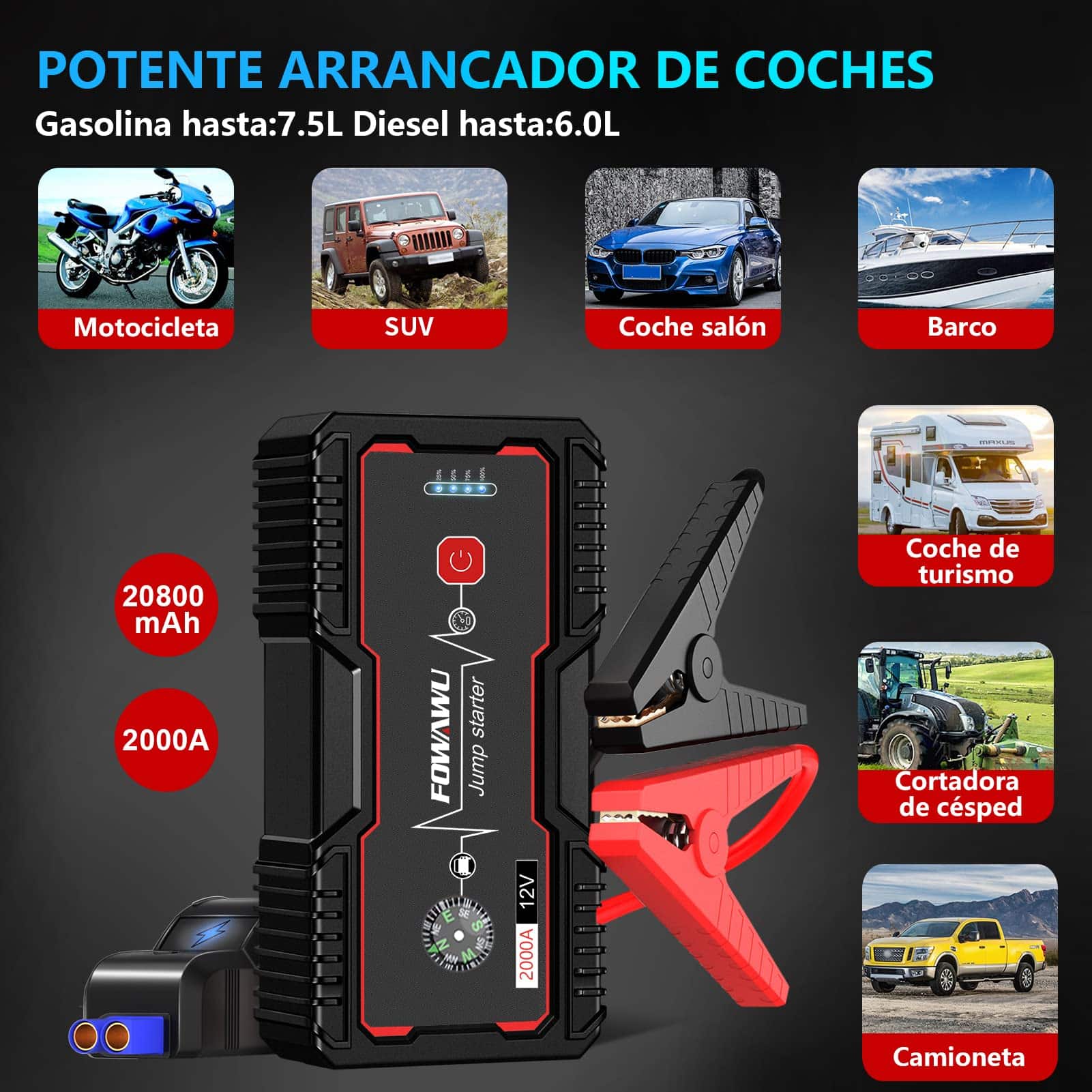 Arrancador de Coche FOWAWU 2000A 20800mAh (Hasta 7.5L de