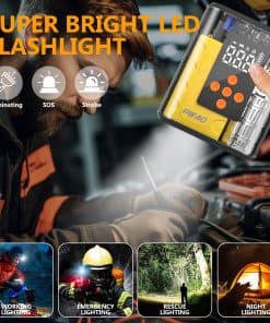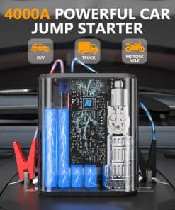 2. Rendimiento de Arranque Potente de Gran Capacidad: Este arrancador de coche de litio de pico de 4000 amperios puede arrancar un vehículo (hasta 9.0L de gasolina/8.0L de motor diésel) en 1-3 segundos, hasta 60 arranques con una carga completa, adecuado para coche, camión, motocicleta, barco, RV o tractor, etc.