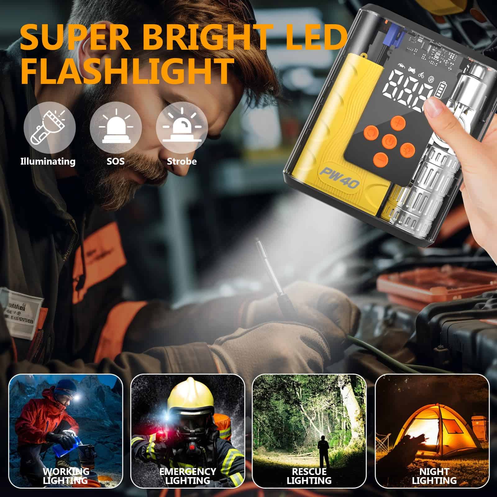 5. Linterna LED y larga duración de la batería: El arrancador de batería utiliza una linterna LED brillante con 3 modos: Luz intermitente, Luz estroboscópica y Luz SOS. Cuando no se usa, este arrancador de batería para coche puede mantener la energía durante aproximadamente 24 meses, siempre listo para ayudarte.