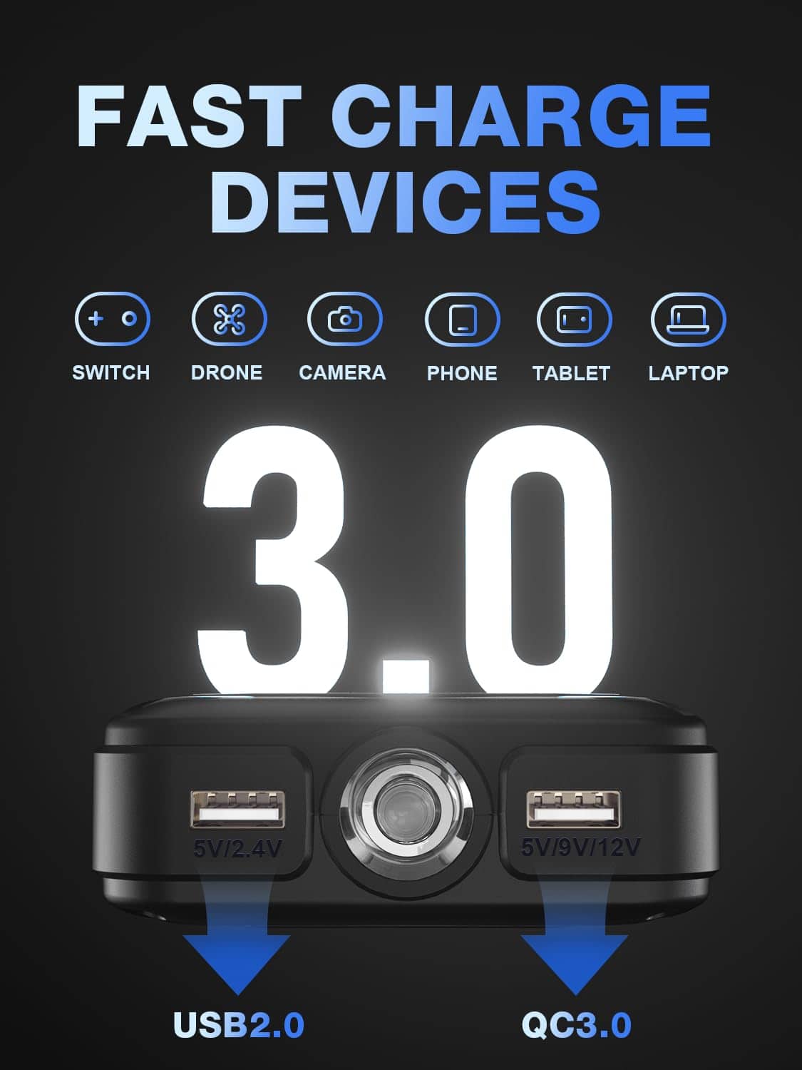 Además de su función de arranque, este dispositivo también actúa como un power bank con doble puerto USB de carga rápida, lo que te permite cargar tus dispositivos electrónicos como teléfonos celulares, tabletas, MP4, PSP, etc., de manera rápida y eficiente. Incluso puedes utilizar el adaptador de encendedor de cigarrillos EC-5 para conectar equipos periféricos del coche, como aspiradoras eléctricas o bombas de aire.