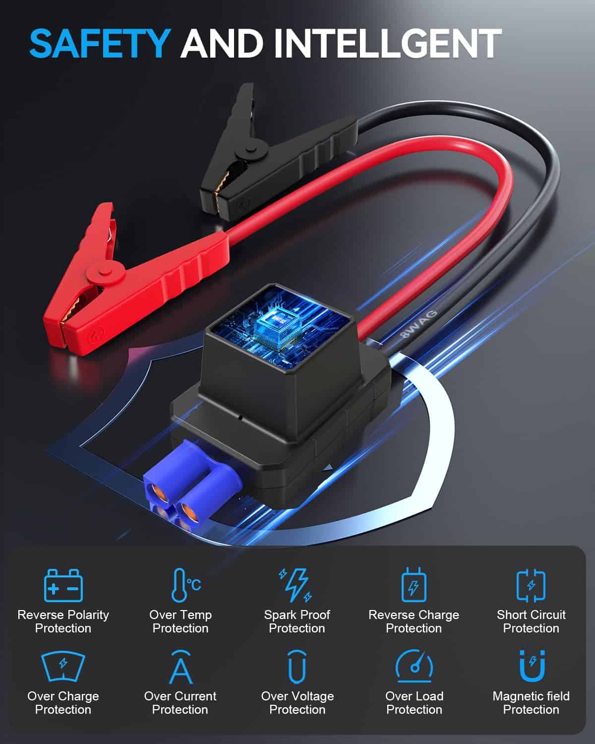 El arrancador NWISE TP20PRO cuenta con un sistema de protección inteligente que incluye 10 protecciones de seguridad para garantizar un uso seguro. Las pinzas de arranque inteligentes, el indicador rojo/verde y el pitido audible te ayudarán a asegurarte de que estás utilizando el dispositivo de manera correcta.