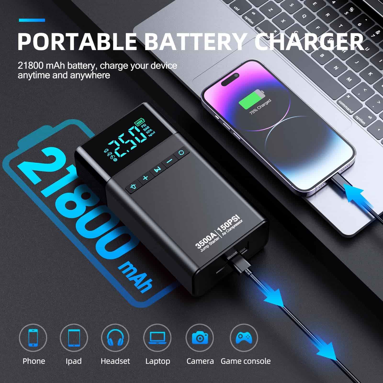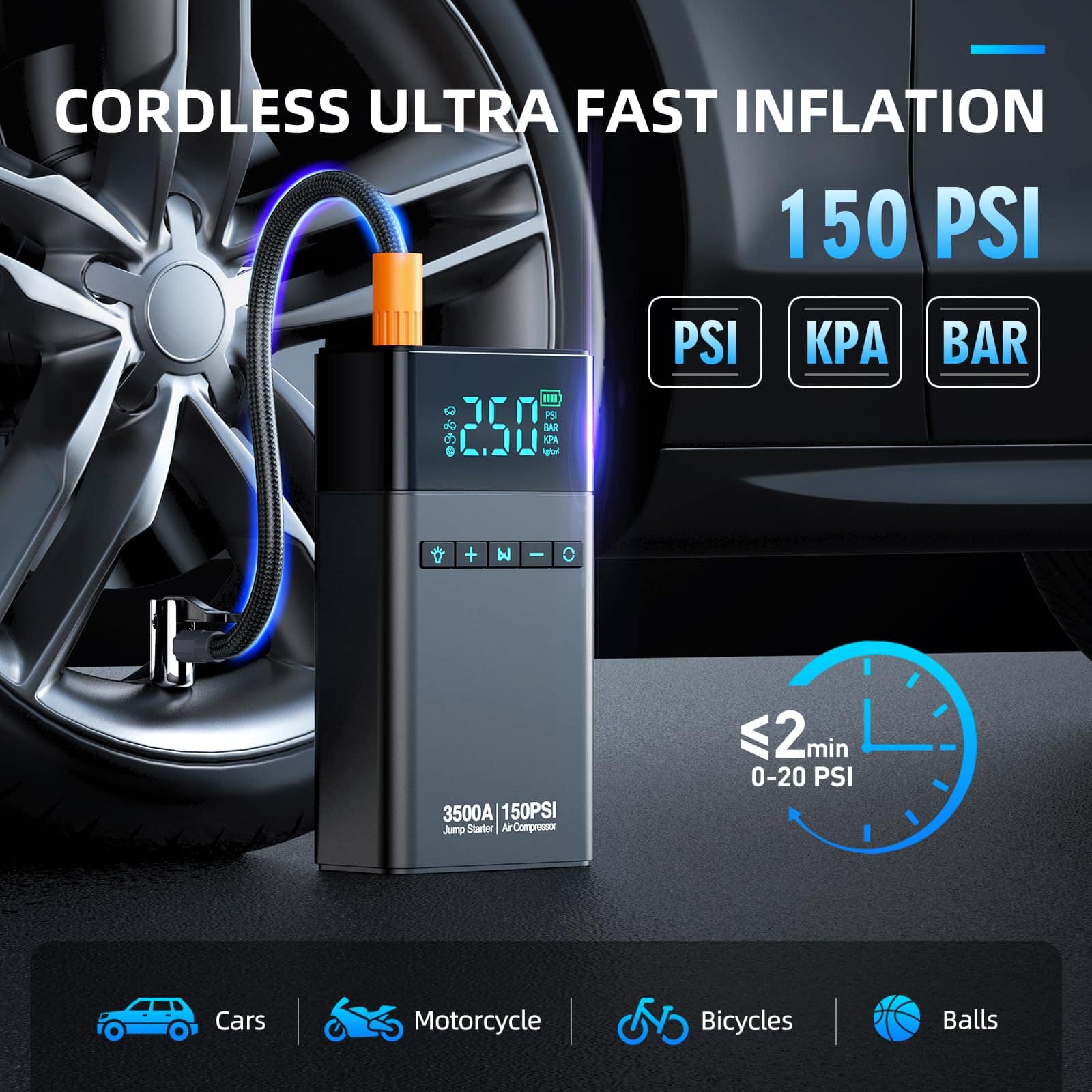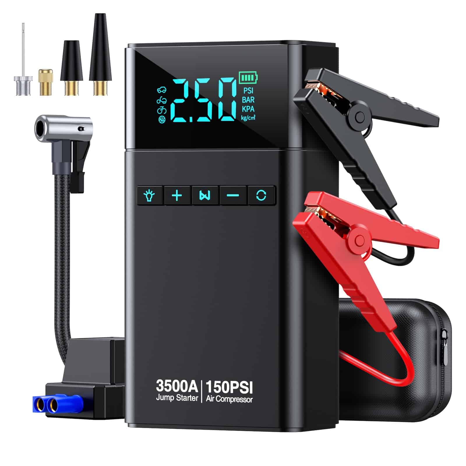 1. MÁS QUE UN ARRANCADOR El arrancador YL03 se deriva del diseño mejorado de 2024 que marcará la tendencia del mercado en el futuro. Este arrancador de batería integra seis funciones como arranque de emergencia de coche, inflador de neumáticos, iluminación, advertencia SOS, carga para dispositivos móviles y arranque de dispositivos montados en vehículos de 12V. 2. ARRANCADOR DE COCHE DE ALTO RENDIMIENTO El chip inteligente mejorado del arrancador de batería YL03 hace que sea fácil y rápido arrancar el coche en entornos extremos (-4 F a 140 F). Potente y seguro. Con una corriente de arranque de 3500A, el arrancador de batería de coche Battery Pack puede reiniciar instantáneamente sus vehículos de 12V (especialmente hasta todo gas/8.0L diésel) incluso en mal clima, soportando más de 1000+ ciclos de recarga. Este jumox para batería de coche dura aproximadamente 24 meses, siempre listo para ayudar. 3. INFLADOR DE NEUMÁTICOS DIGITAL INTELIGENTE CON PANTALLA LED Preseteo inteligente y apagado automático sin necesidad de ajustes y comprobaciones repetidas. Con un turbo único de 35L/Min (150 PSI) que dura 25 minutos. No solo eso, nuestro arrancador YL03 con compresor de aire puede ajustar el modo de inflado en cualquier momento durante el proceso de bombeo. El arrancador de coche portátil con compresor de aire infla rápidamente un neumático de coche a 20 PSI en solo 2 minutos, 4 boquillas diferentes para inflar coches, bicicletas, pelotas, etc. Gran pantalla LCD para leer datos en tiempo real, 4 opciones de cambio de unidad y manguera de aire extendida desmontable para mayor comodidad. 4. LUZ DE EMERGENCIA Y BANCO DE ENERGÍA PORTÁTIL ¡Adiós a los viejos arrancadores de baterías voluminosos! YLO3 es más ligero y portátil y X7 no solo es un jumox, banco de energía, inflador de neumáticos y linterna LED, puertos USB duales para cargar dispositivos móviles. El pack de arrancador YL03 solo necesita diez minutos para cargarse por completo e inflar un neumático. Además, la luz LED de 300 lúmenes equipada con el arrancador de batería X7 es compatible con 3 modos de iluminación: iluminación continua (blanco), destello y SOS (rojo). 5. MULTI-PROTECCIÓN, SEGURIDAD Y SEGURIDAD Arrancador YL03 con cables de puente pesados extendidos para llegar a terminales de batería variadas, 10 tecnologías de protección de seguridad integradas (polaridad inversa, antichispa, cortocircuito, sobrecarga, sobrecorriente, baja temperatura, alta temperatura, sobre voltaje, sobrecarga, carga inversa). Los cables de puente detectan automáticamente la conexión y las alarmas visibles en tiempo real, el arrancador portátil del cargador de batería del coche es 100% seguro, sin chispas. 6. DISEÑO TÉRMICO MEJORADO El exclusivo diseño de disipación de calor en panal permite al arrancador de batería X7 obtener un rendimiento de disipación de calor más potente, por lo que el rendimiento de seguridad del arrancador de coche X7 se mejora en un 30%, y su vida útil se promueve en un 50%. 7. LO QUE RECIBE 1 X Arrancador de Coche CZKBG Power Bank X1, Bolsa de Almacenamiento Práctica X1, Cable de Puente Inteligente X1, Línea Inflable de Seguridad X1, Boquilla de Aire X4, Cable de Carga USB Tipo-C X1, Manual del Usuario X1, Garantía de 12 meses y Soporte Técnico de por Vida. Si tiene alguna pregunta postventa sobre el arrancador, no dude en contactarnos. 8. NOTA Por favor, no use la función de bomba de aire de forma continua. Cuando el compresor de batería del neumático se calienta mucho, por favor, enfríelo durante unos minutos antes de seguir inflando el neumático. Por favor, cargue el arrancador por completo cuando lo reciba por primera vez, aunque muestre batería completa. Se sugiere arrancar el coche cuando la energía sea mayor del 25%. Por favor, recargue el paquete de arranque de coche cada 2-3 meses para activar la batería y prolongar la vida útil del arrancador portátil.