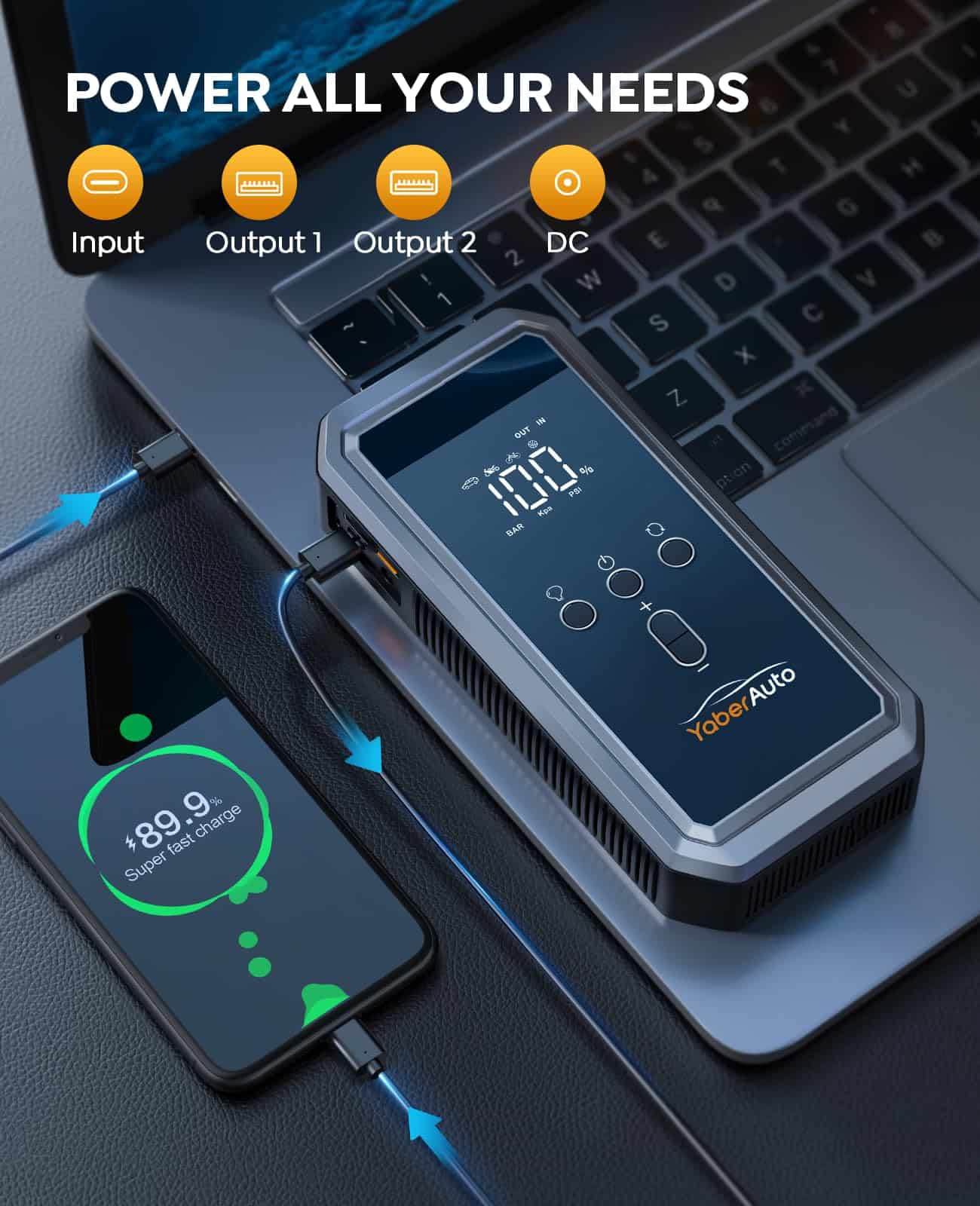 Arrancador de Coche YaberAuto 8-en-1 con Compresor de Aire